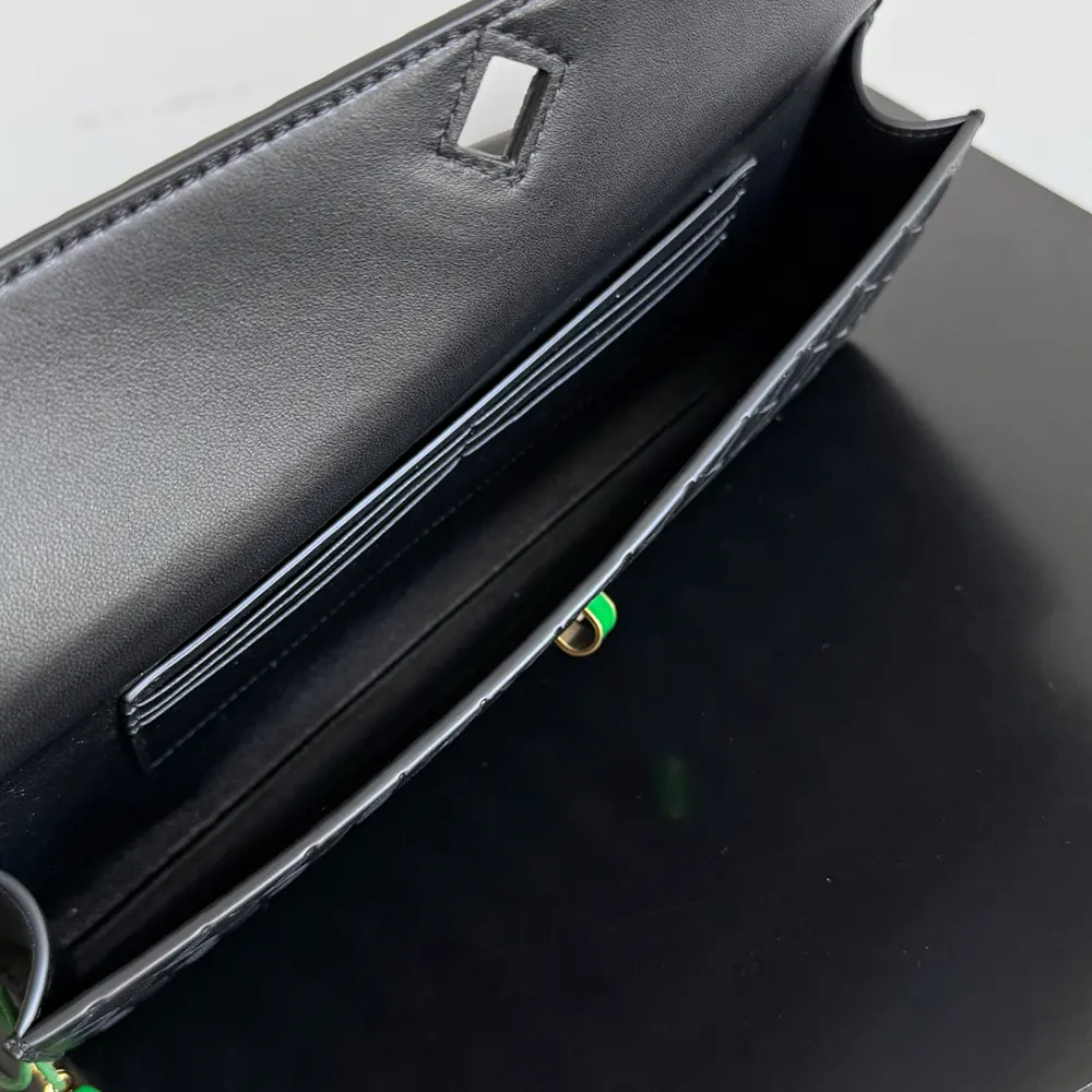 - Top handle clutch in Intrecciato leather with enamelled daisy flower closure.