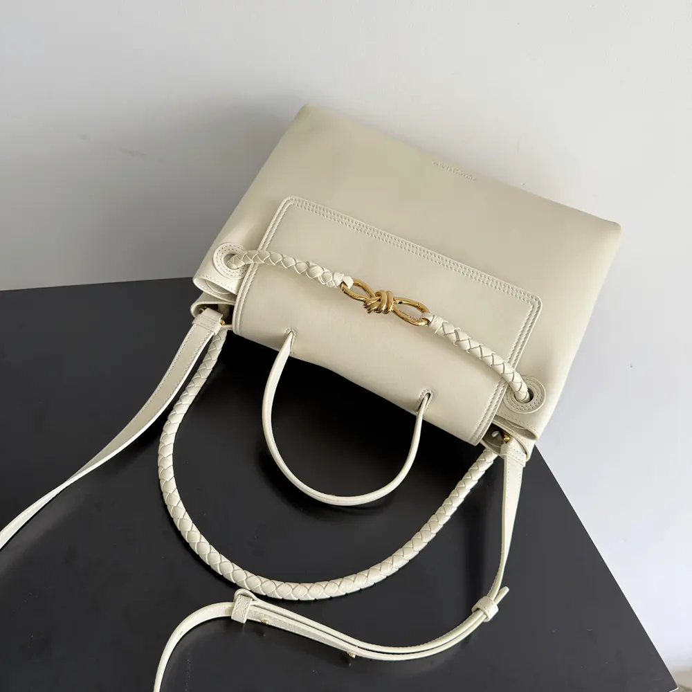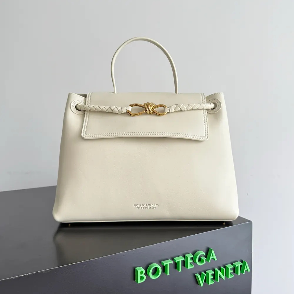 - Top handle bag in silky calf leather with two-way flap and signature knot detail.