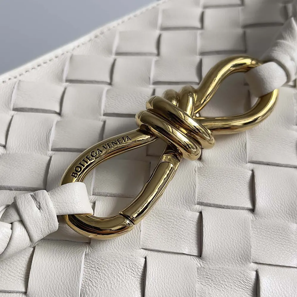 - Top handle bag in supple Intrecciato leather with signature knot detail and sliding cross-body strap.