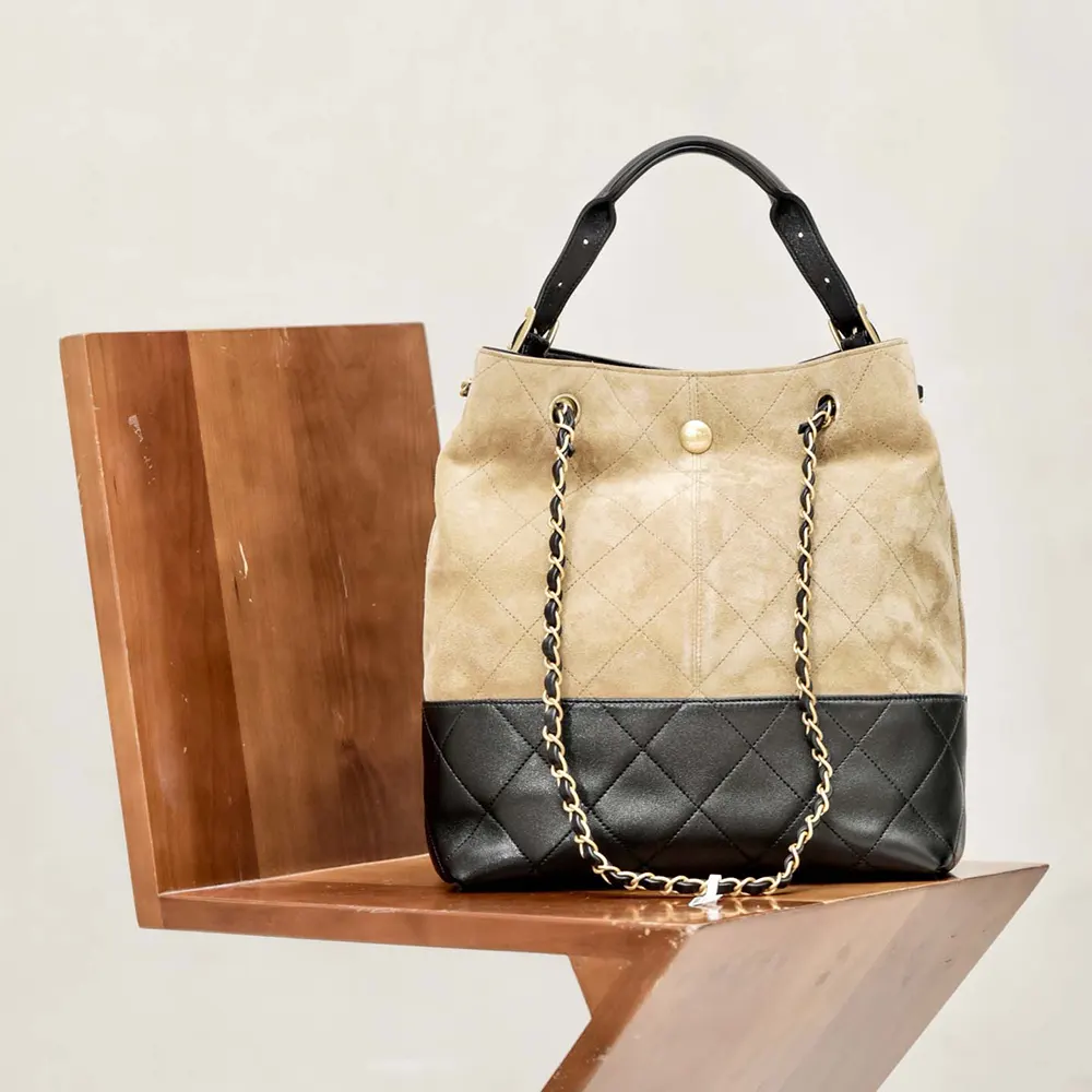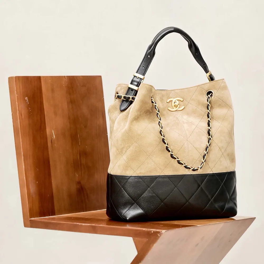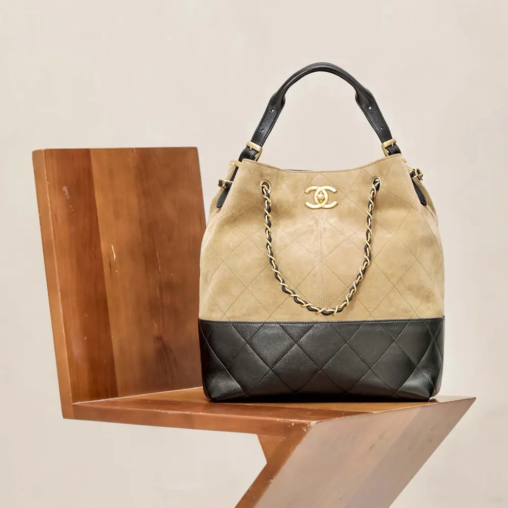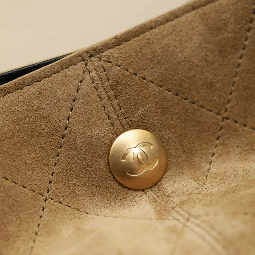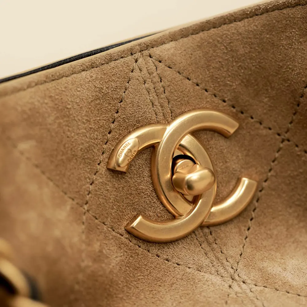 Chanel Women Shopping Bag Suede Calfskin Shiny Lambskin Gold Tone Metal