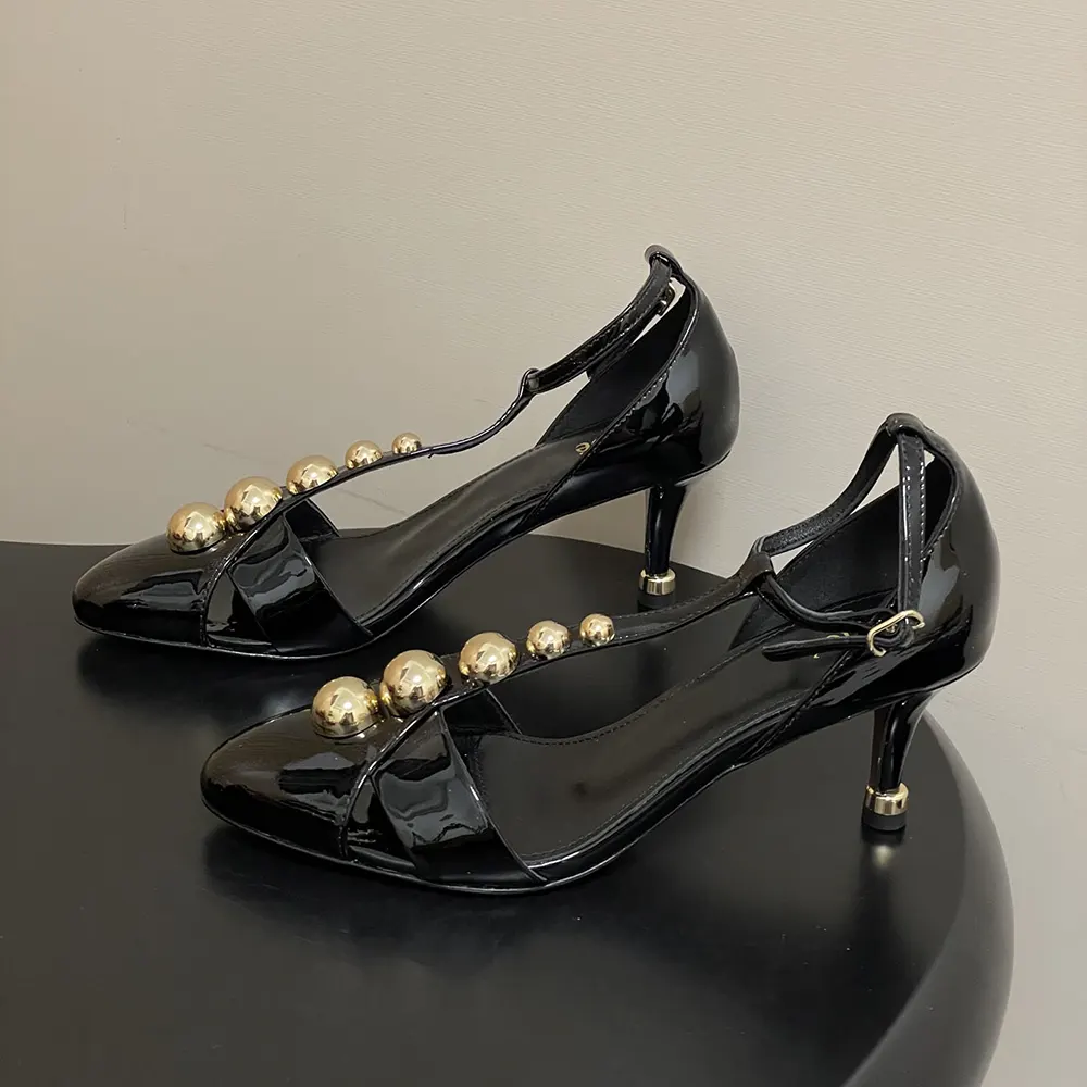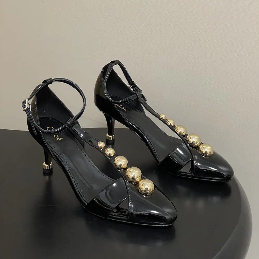 • Crafted from patent calfskin, these Cleia heeled sandals feature a cut-out, T-strap silhouette embellished with gold-tone cabochon studs.