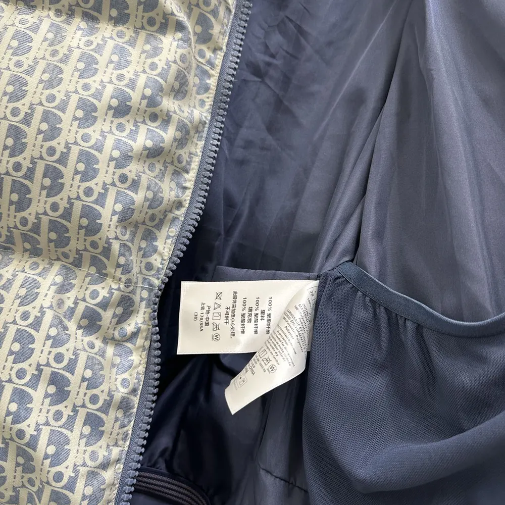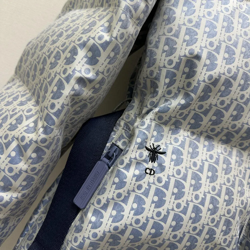 • Crafted in blue and white Dior Oblique quilted technical taffeta, it features a stand collar, side pockets, interior zip pockets and a ski-pass pocket.