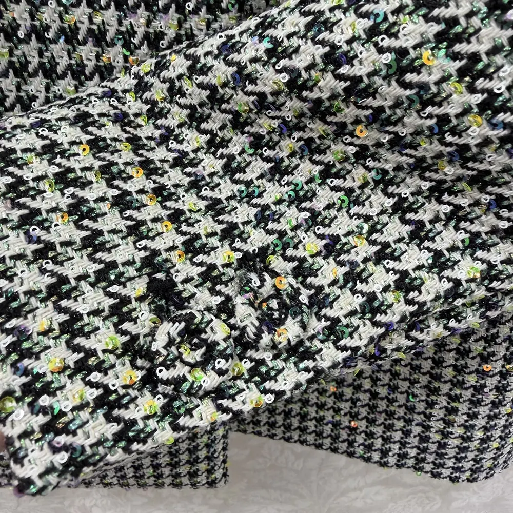 - Crafted in a virgin wool blend with a black and white houndstooth motif, it is adorned with multicolor sequins.