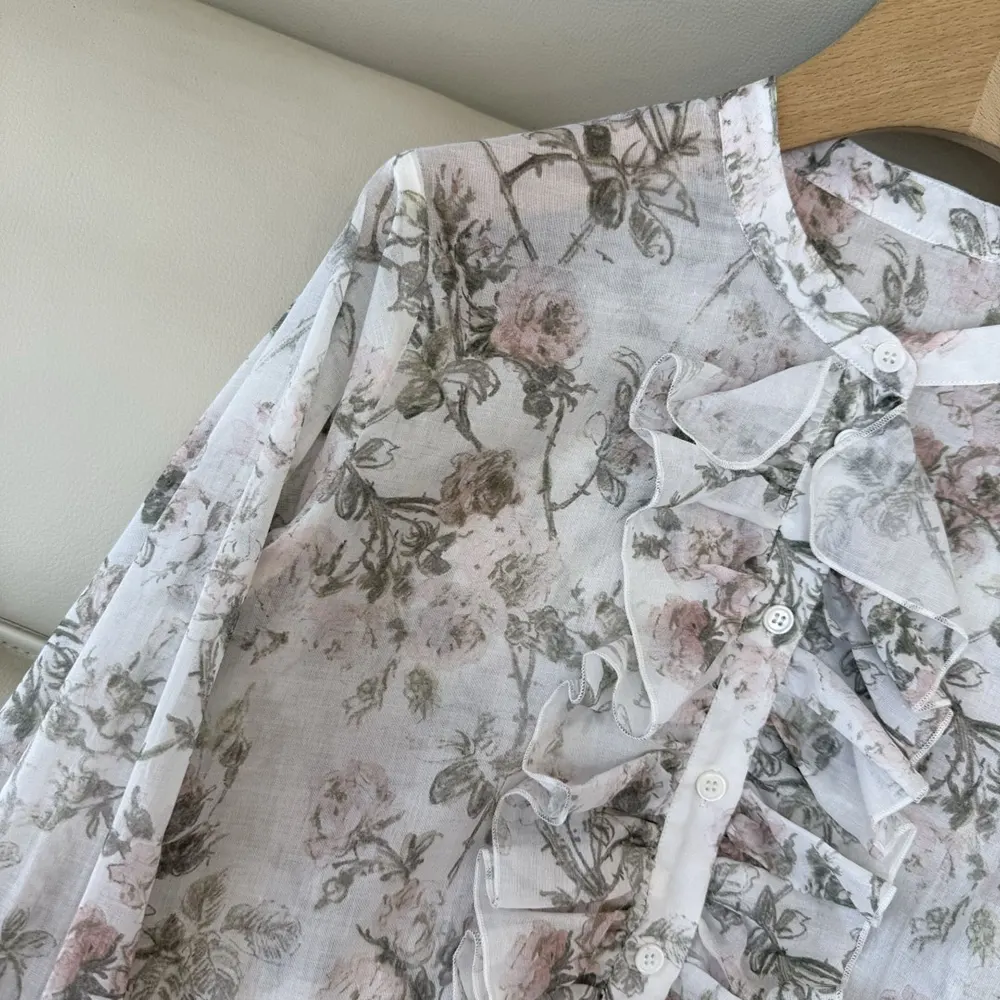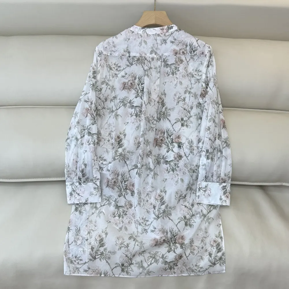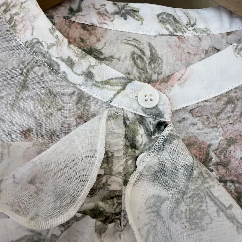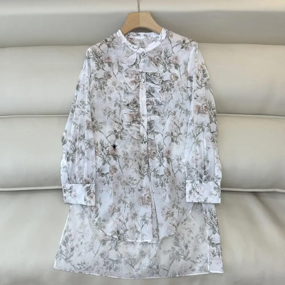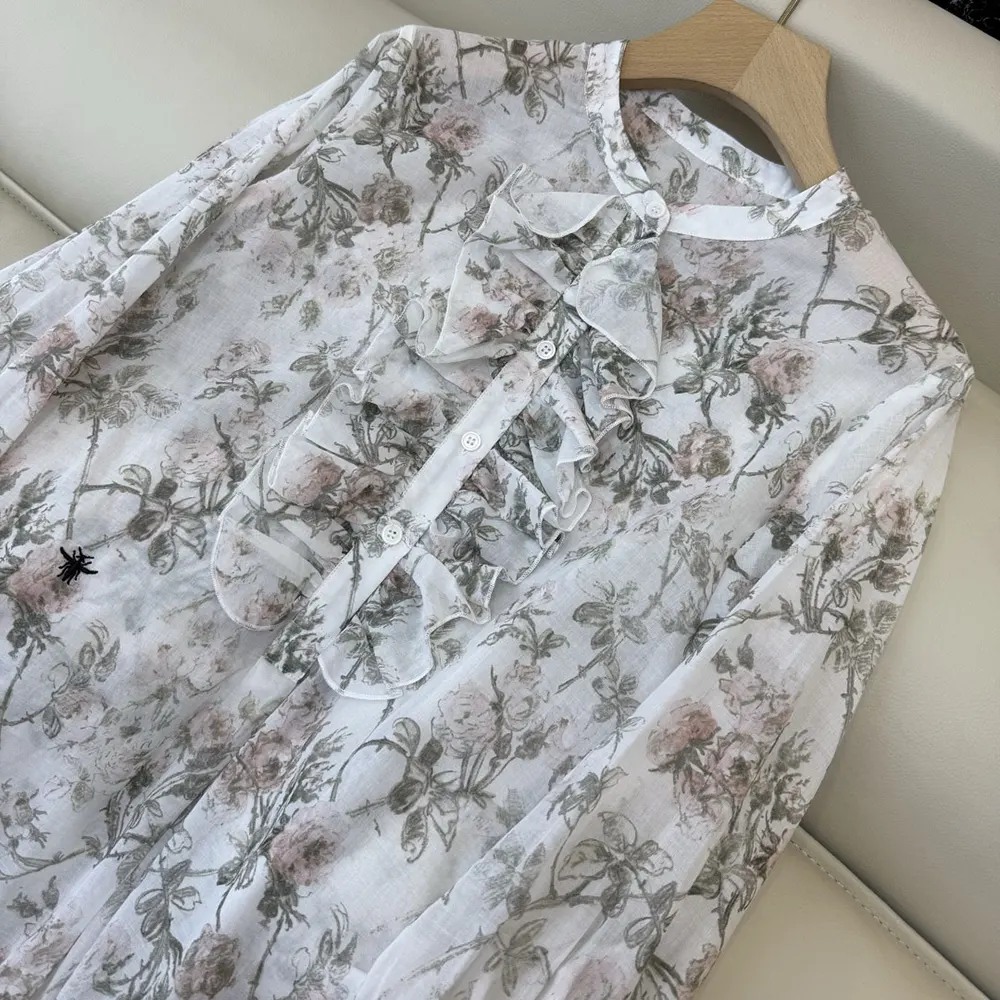 Dior Women Blouse White Cotton Muslin with Multicolor Rosier de Dior Motif