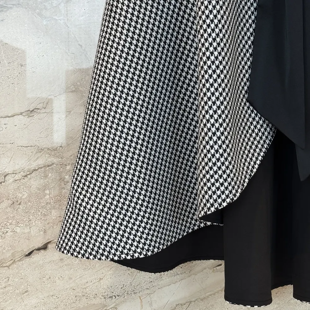 - Crafted in a black and white houndstooth silk-virgin-wool blend, it has a flared silhouette enhanced by a removable black satin collar, adorned with a silver-finish metal CD signature and a chain.