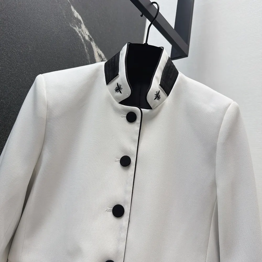 - Demonstrating the House’s exceptional savoir-faire, the officer collar is adorned with two hallmark embroidered bees, while black passementerie adds a delicately contrasting detail to the cuffs as well as the patch pockets highlighting the waist.
