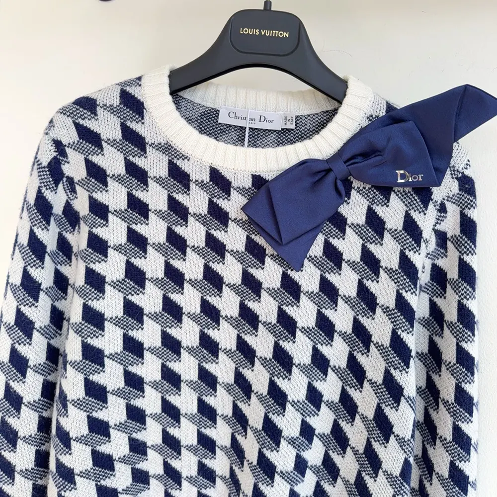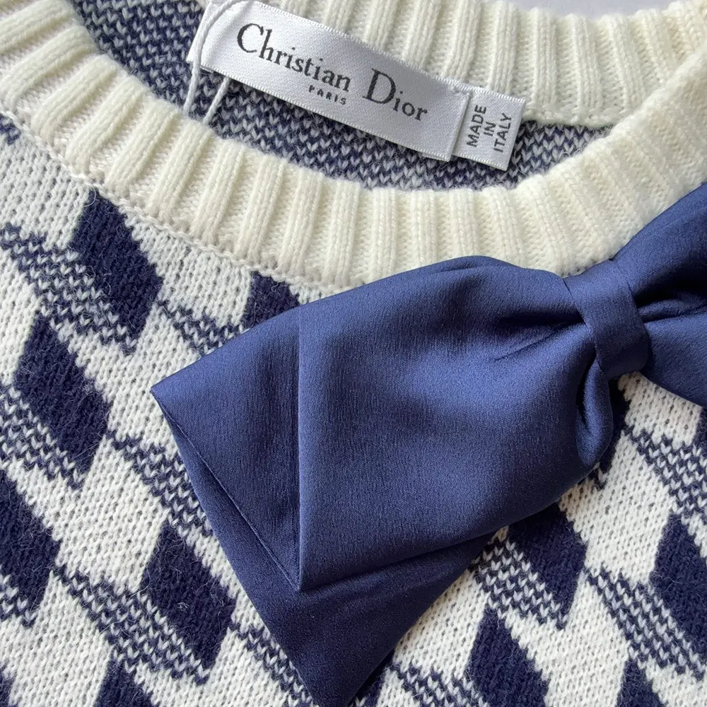 - Knit in wool with a navy blue and white houndstooth motif, it is distinguished by a navy blue satin bow adorning the neck with a silver-finish metal Dior signature.