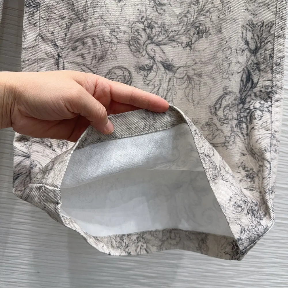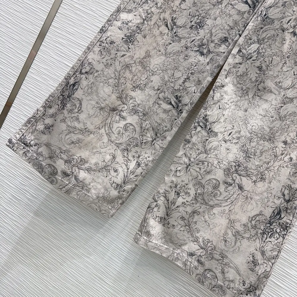 - The denim pants showcase the Dior Barocco motif, drawing inspiration from the collection’s flagship theme with flowers, butterflies and delicate arabesques.