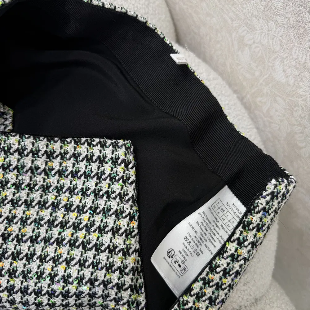 • Crafted in a virgin wool blend with a black and white houndstooth motif, it is adorned with multicolor sequins highlighting the slightly flared, refined silhouette.