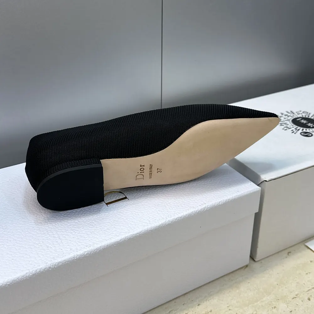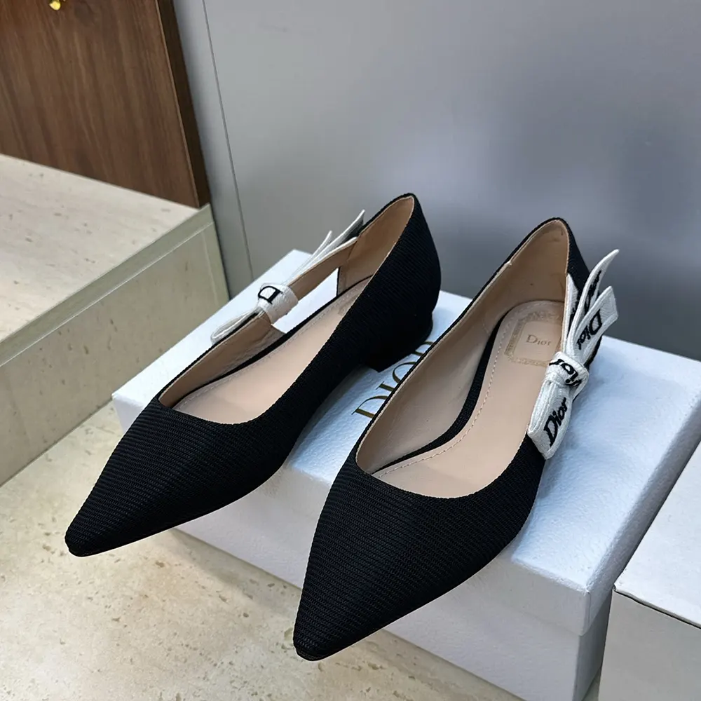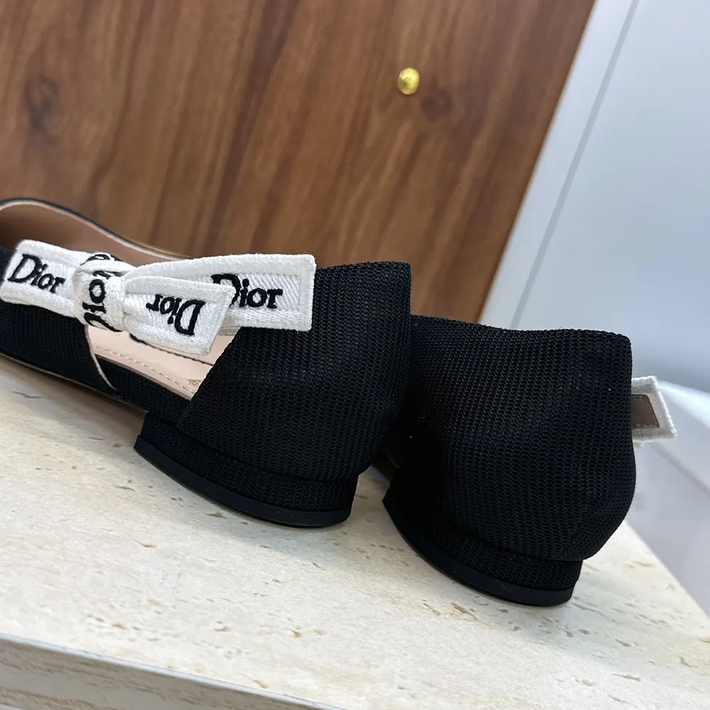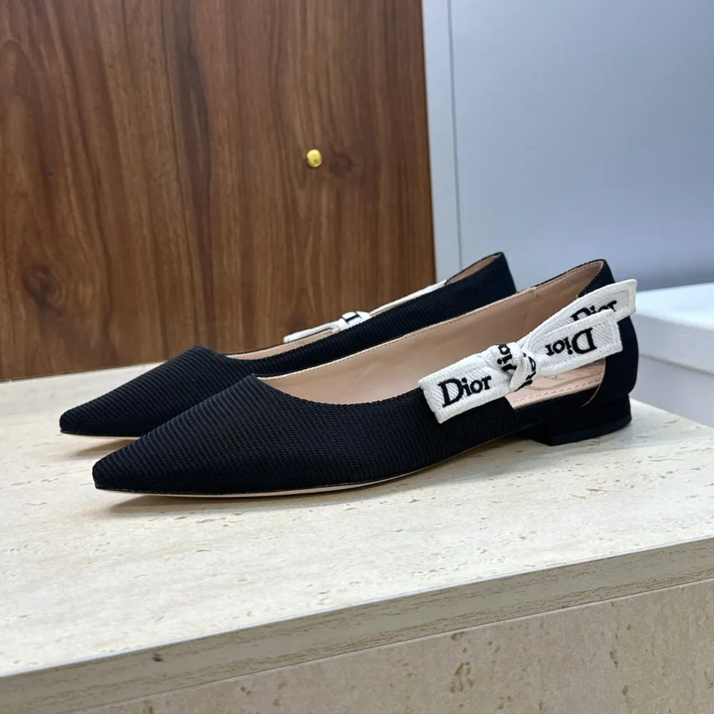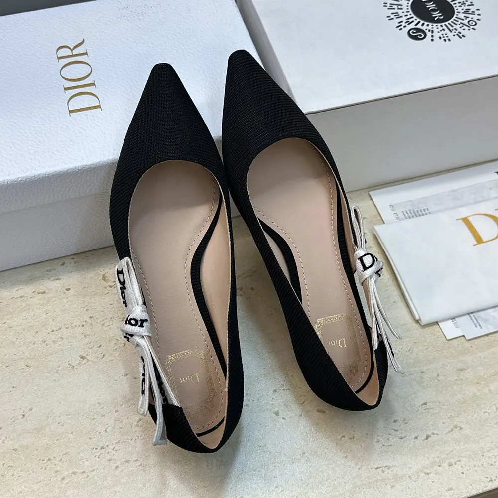 - The style is crafted in black technical fabric, its silhouette standing out with a pointed toe and a graphic cutout on the sides showcasing a two-tone Dior-embroidered ribbon adorned with a bow.