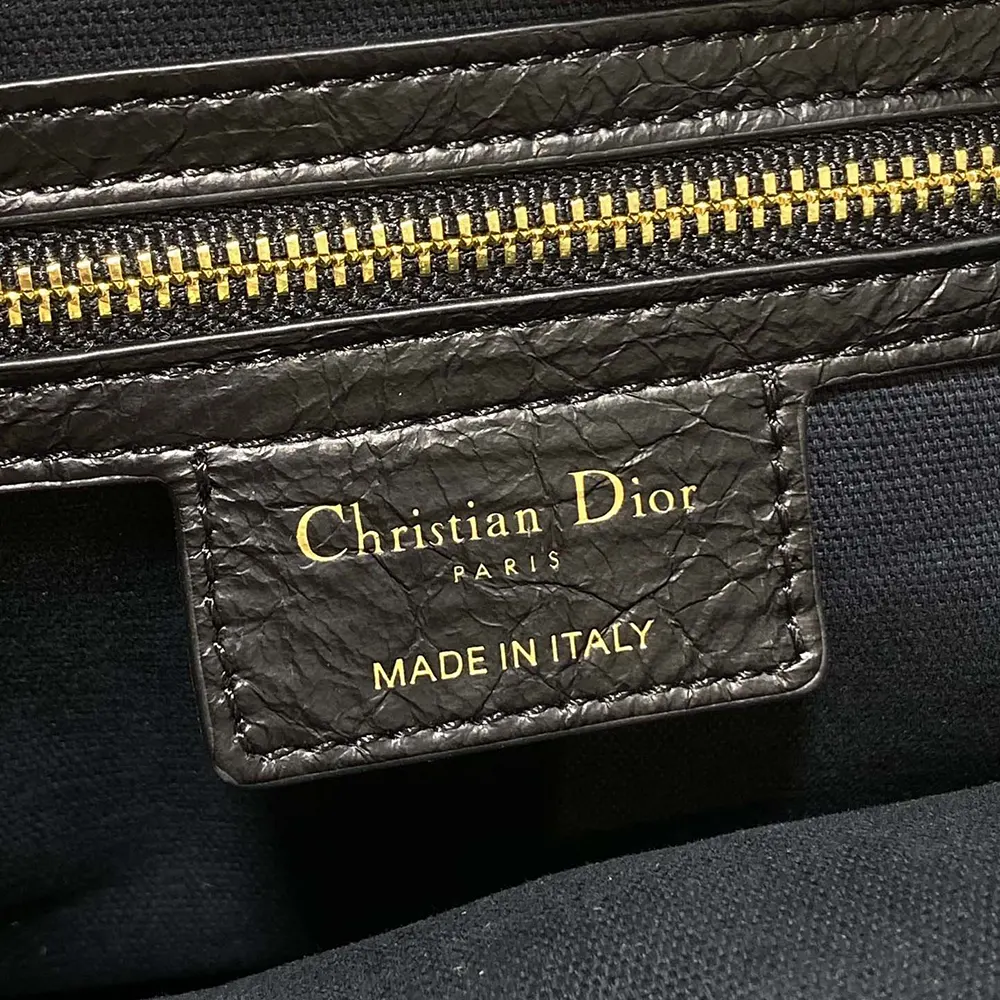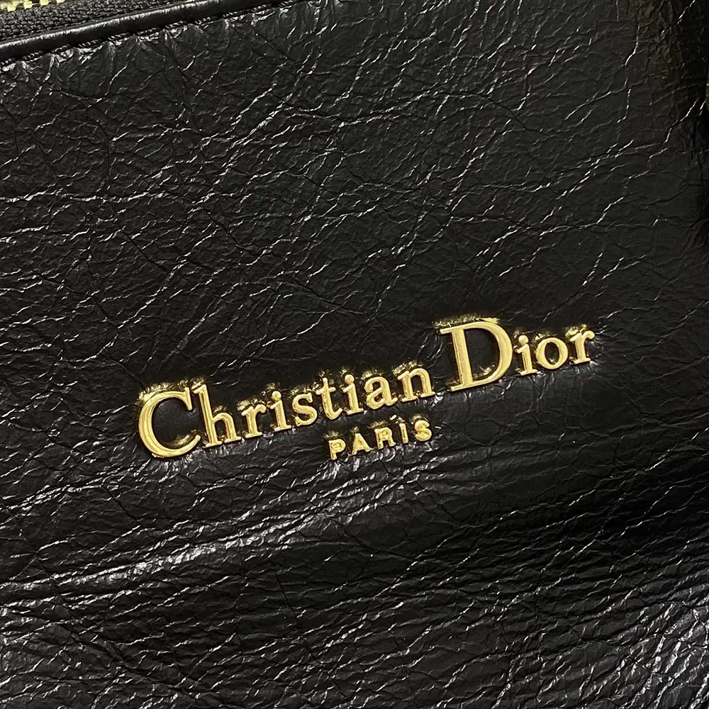 • it showcases an antique gold-finish metal Christian Dior Paris signature on the front, elevating the supple silhouette.