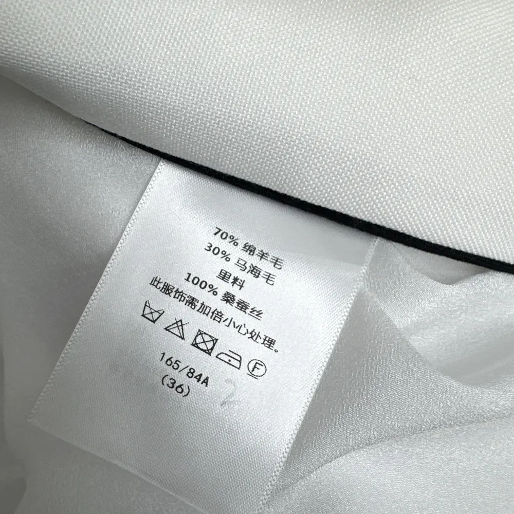 - Demonstrating the House’s exceptional savoir-faire, the officer collar is adorned with two hallmark embroidered bees, while black passementerie adds a delicate contrast to the waist and cuffs.