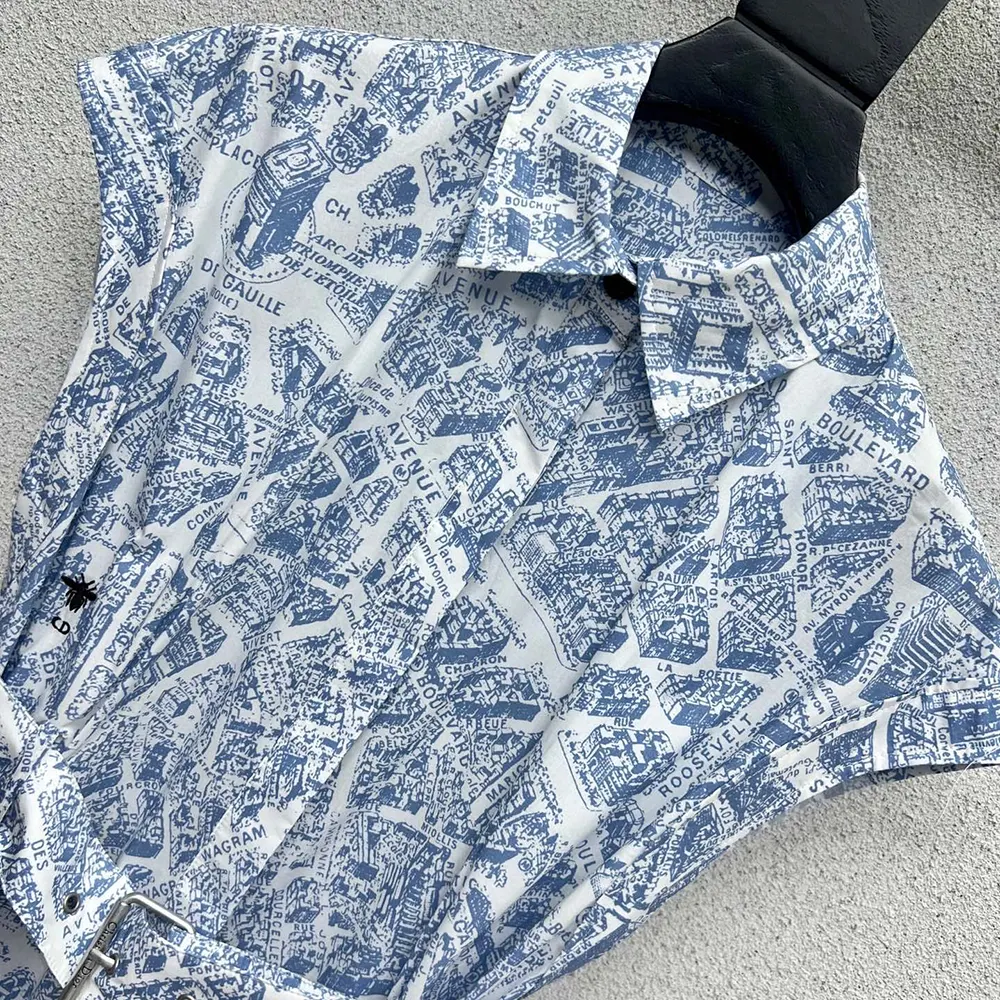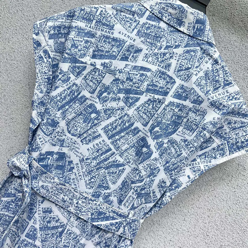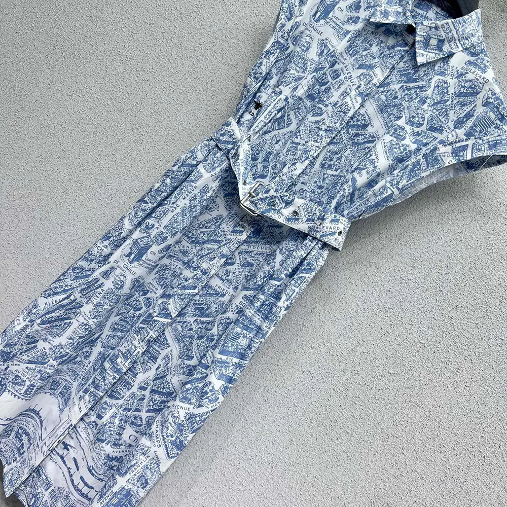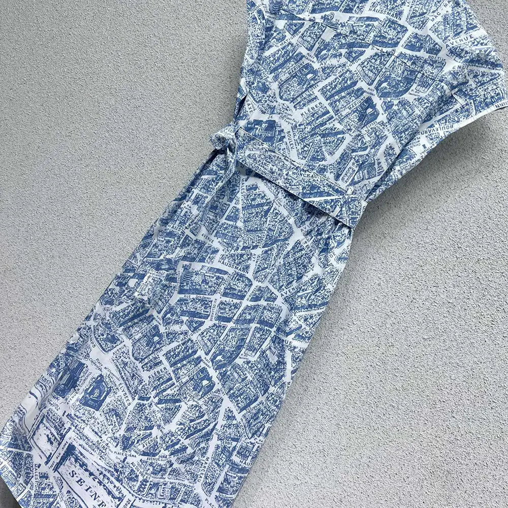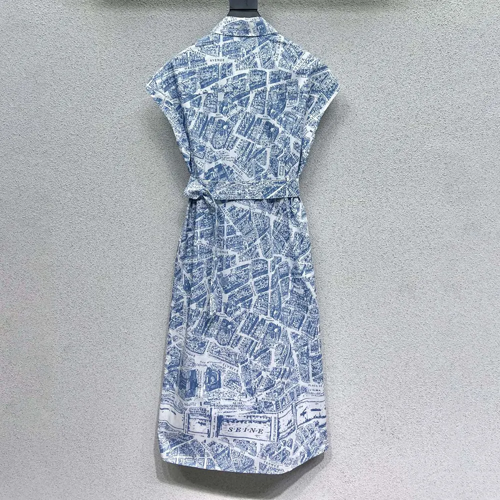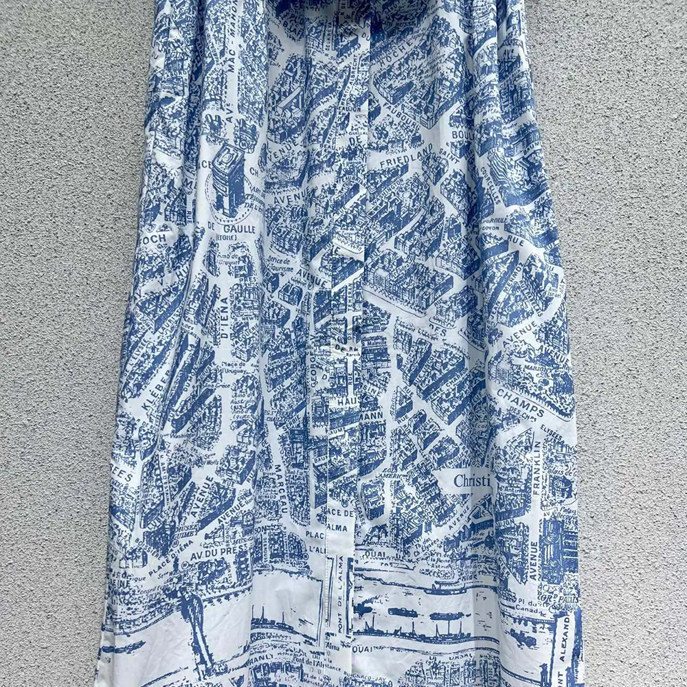 • The shirtdress showcases the now-hallmark white and chambray blue Plan de Paris motif,
