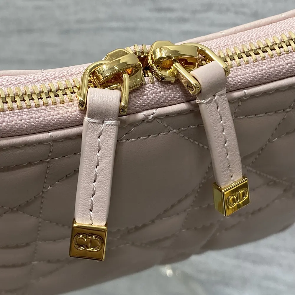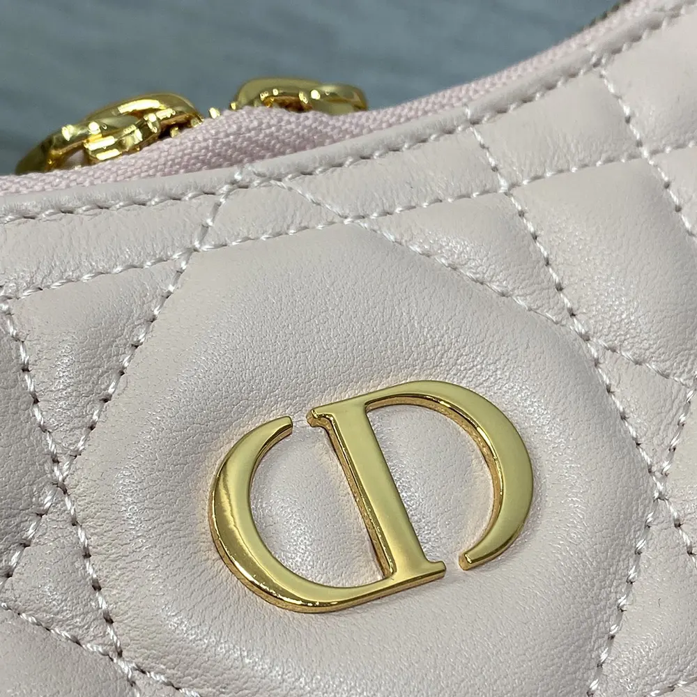 - Crafted in powder pink lambskin with Macrocannage topstitching, it is enhanced by a gold-finish metal CD signature on the front and features a zip compartment to hold all the essentials.