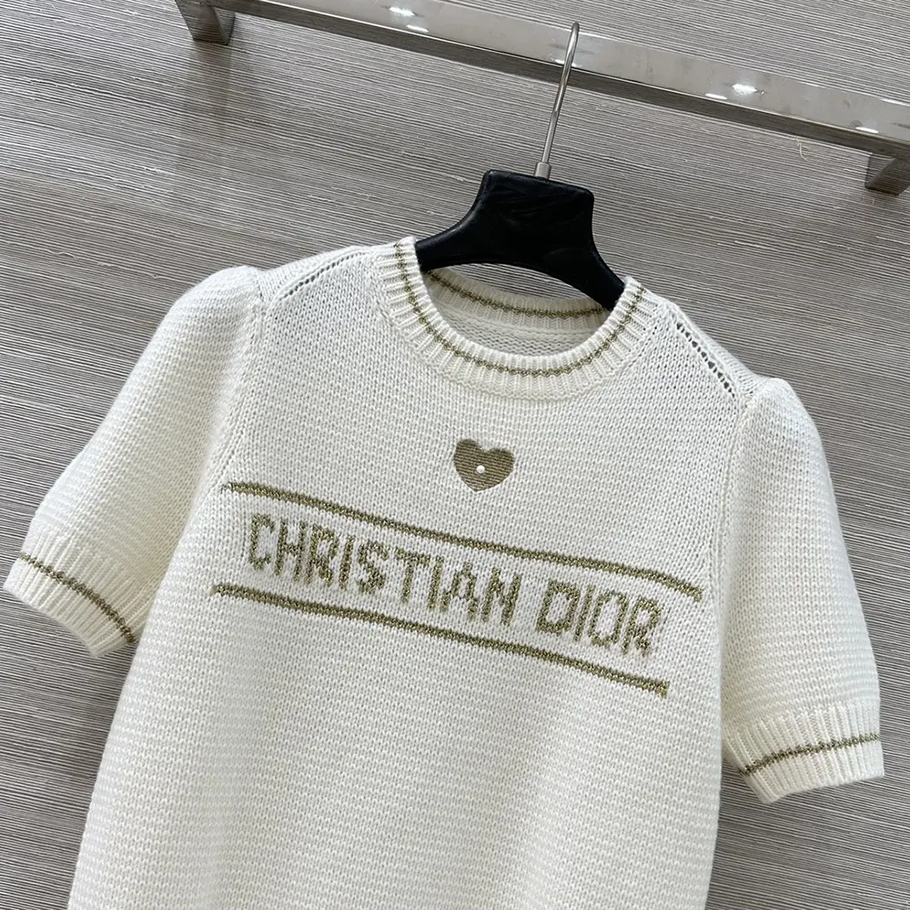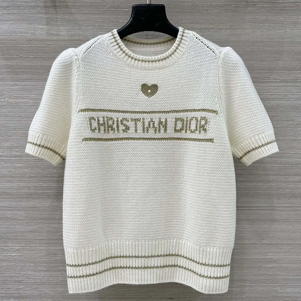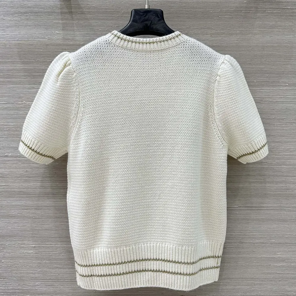Specification: Dior Women Short-Sleeved Sweater Ecru and Gold-Tone Virgin Wool-Cashmere-Blend Knit