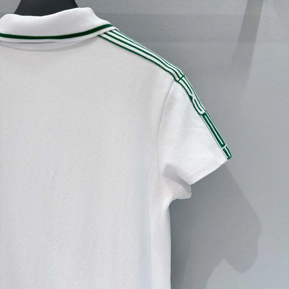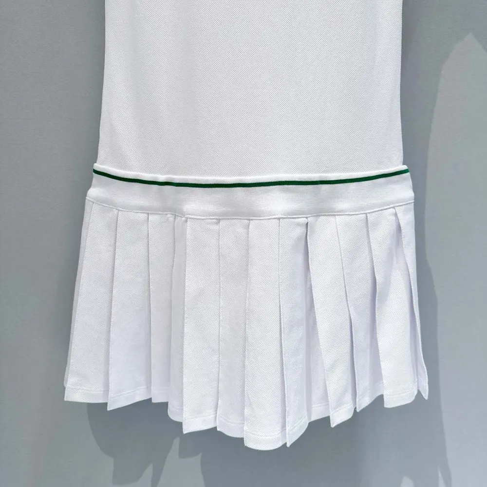 - Crafted in white cotton jersey, it features a buttoned polo collar and flared skirt enhanced by pleats.