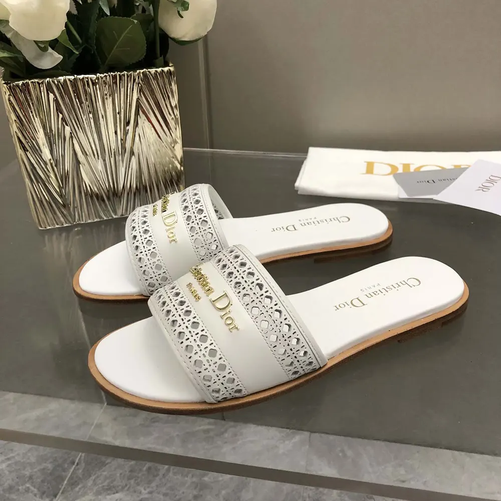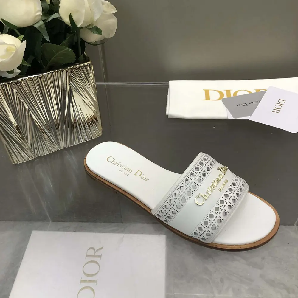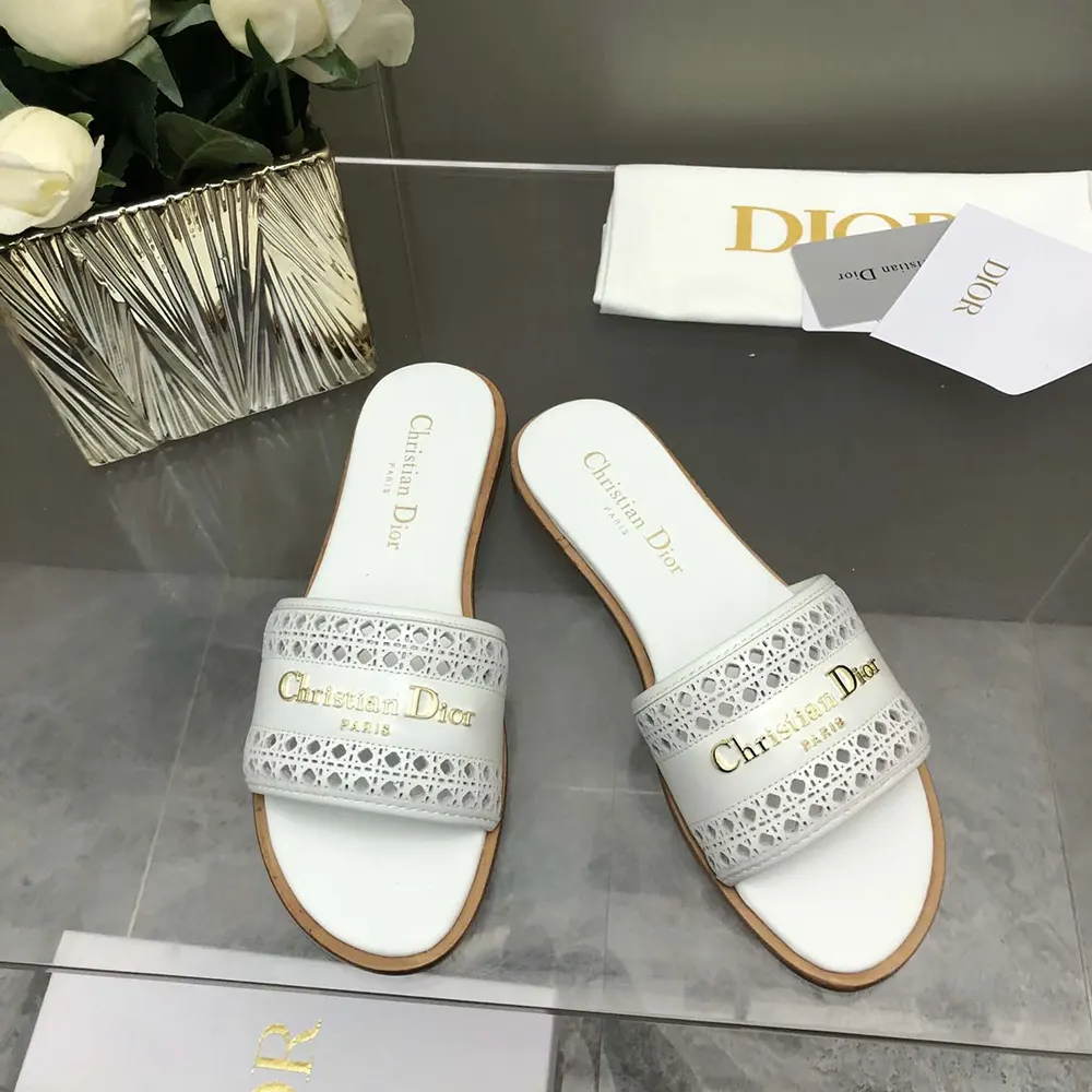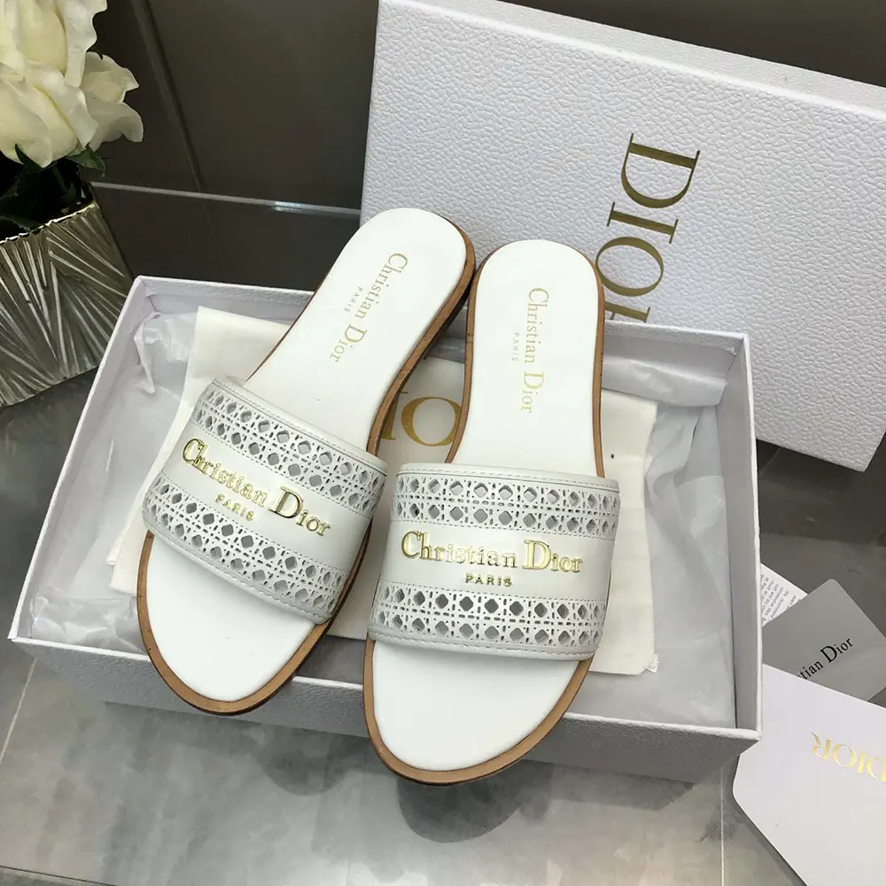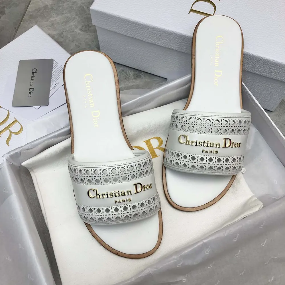 - The white openwork Microcannage calfskin upper is adorned with a gold-finish metal Christian Dior Paris signature,