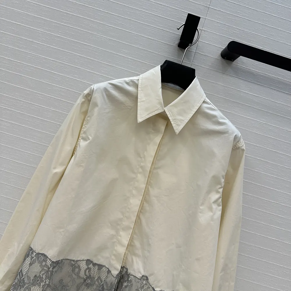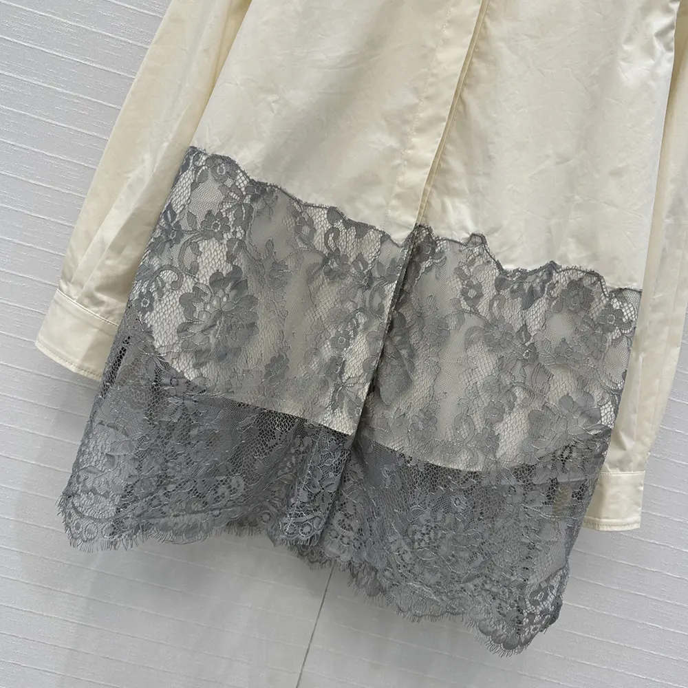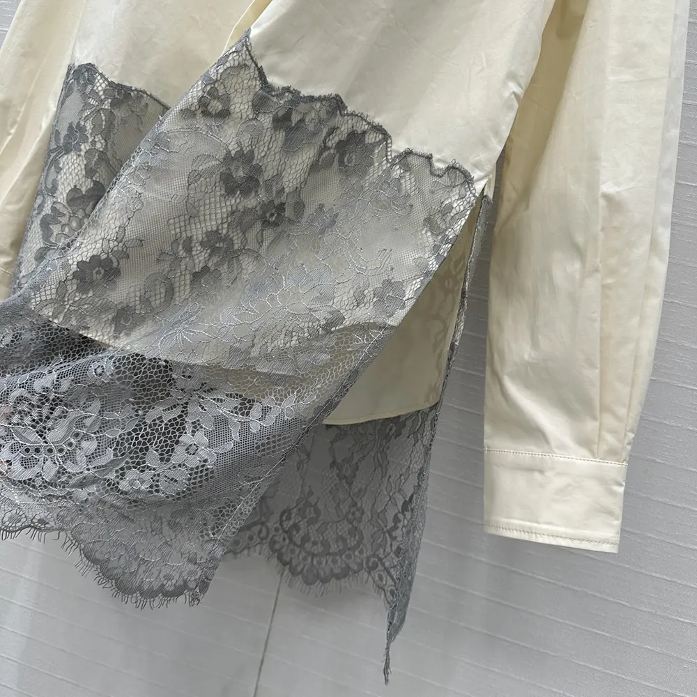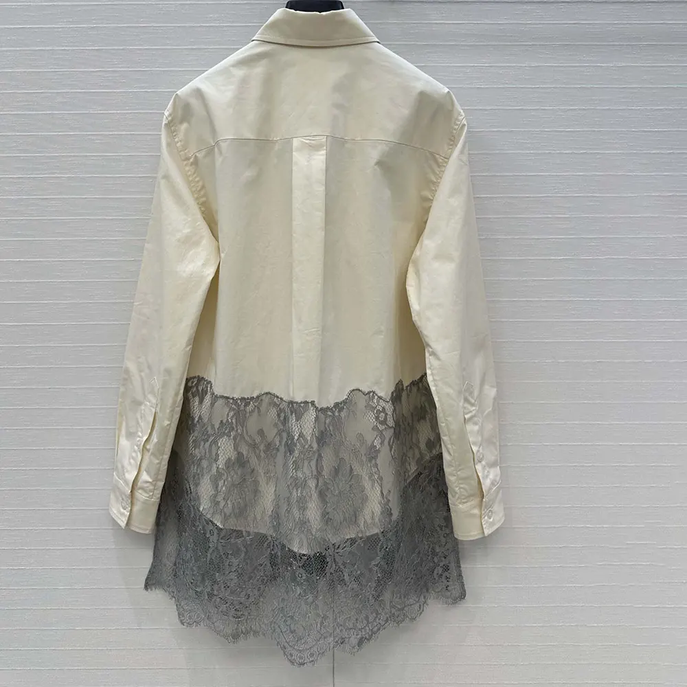 - Oversized long sleeve shirt. Made of white cotton poplin. Embellished with lace embroidery on the bottom.