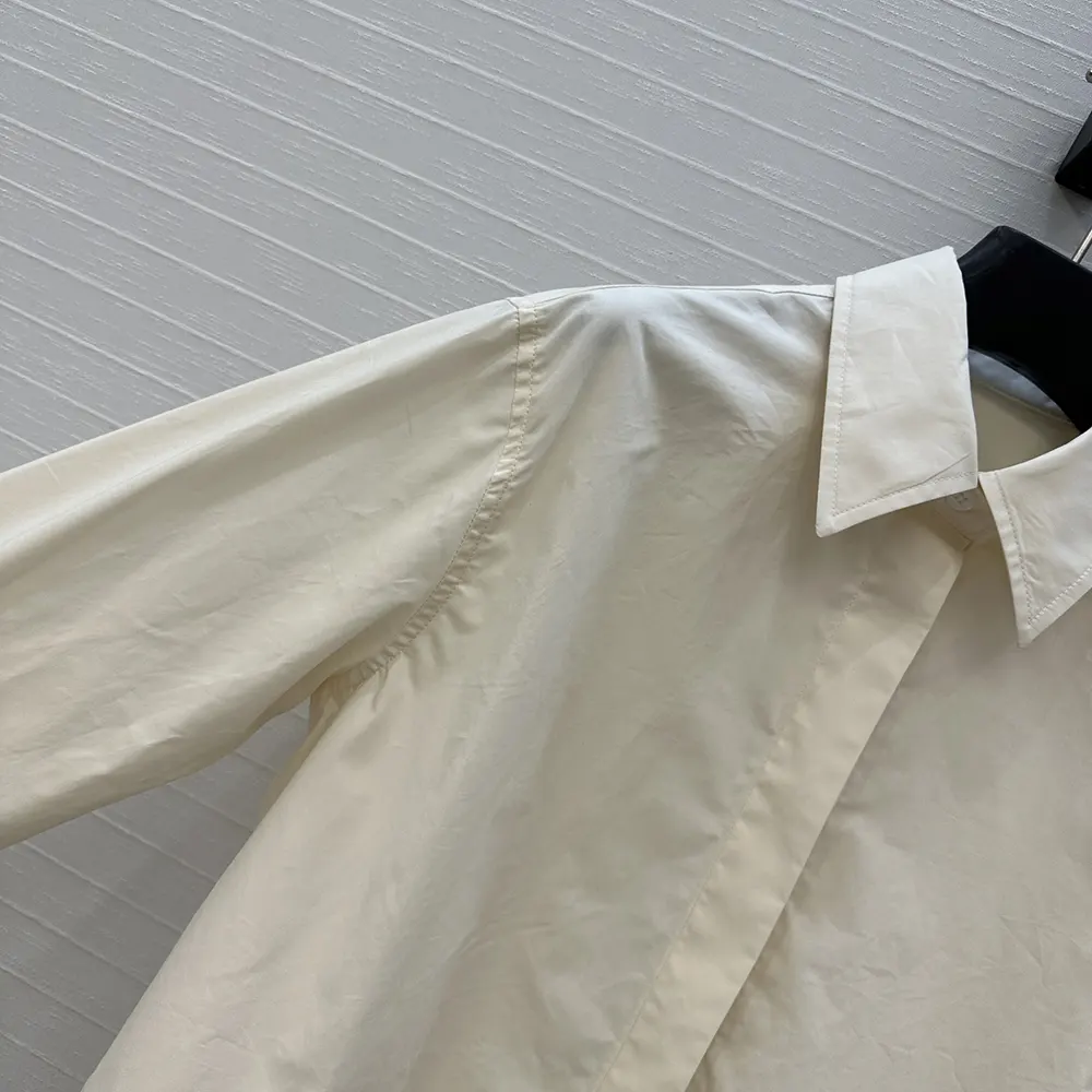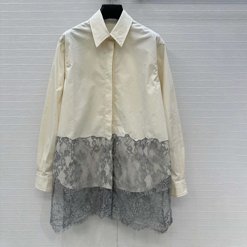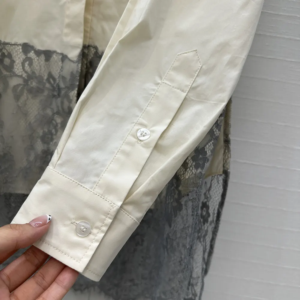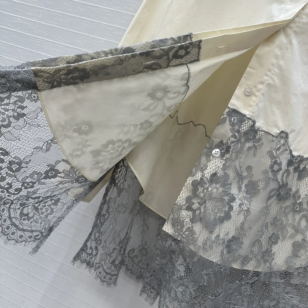 - Oversized long sleeve shirt. Made of white cotton poplin. Embellished with lace embroidery on the bottom.