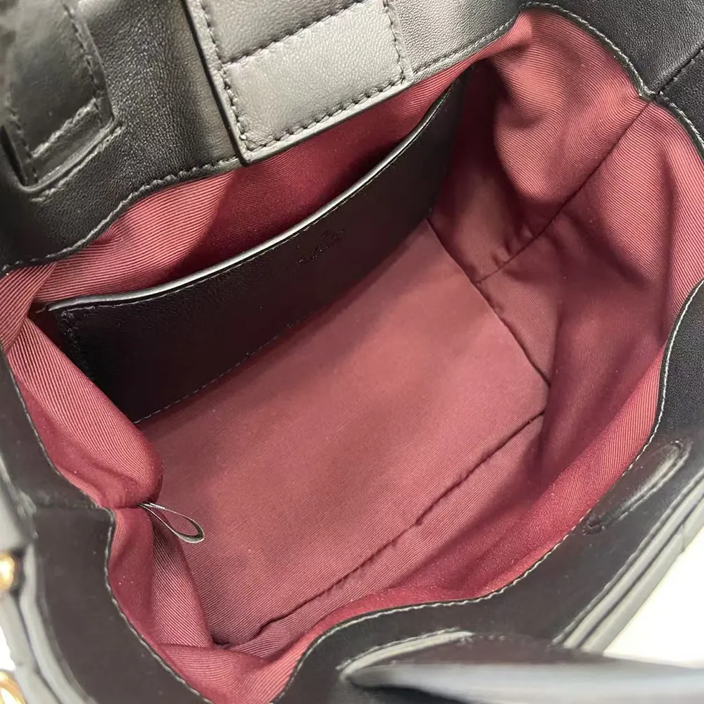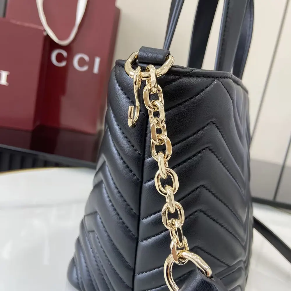 - The style is completed with top handles and a chain shoulder strap,