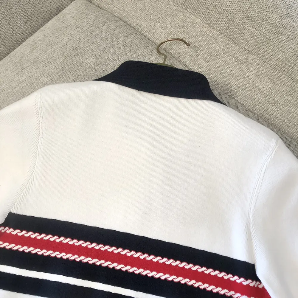 - This striped cotton needle stitch top is defined by an intricate red knot intarsia trim.