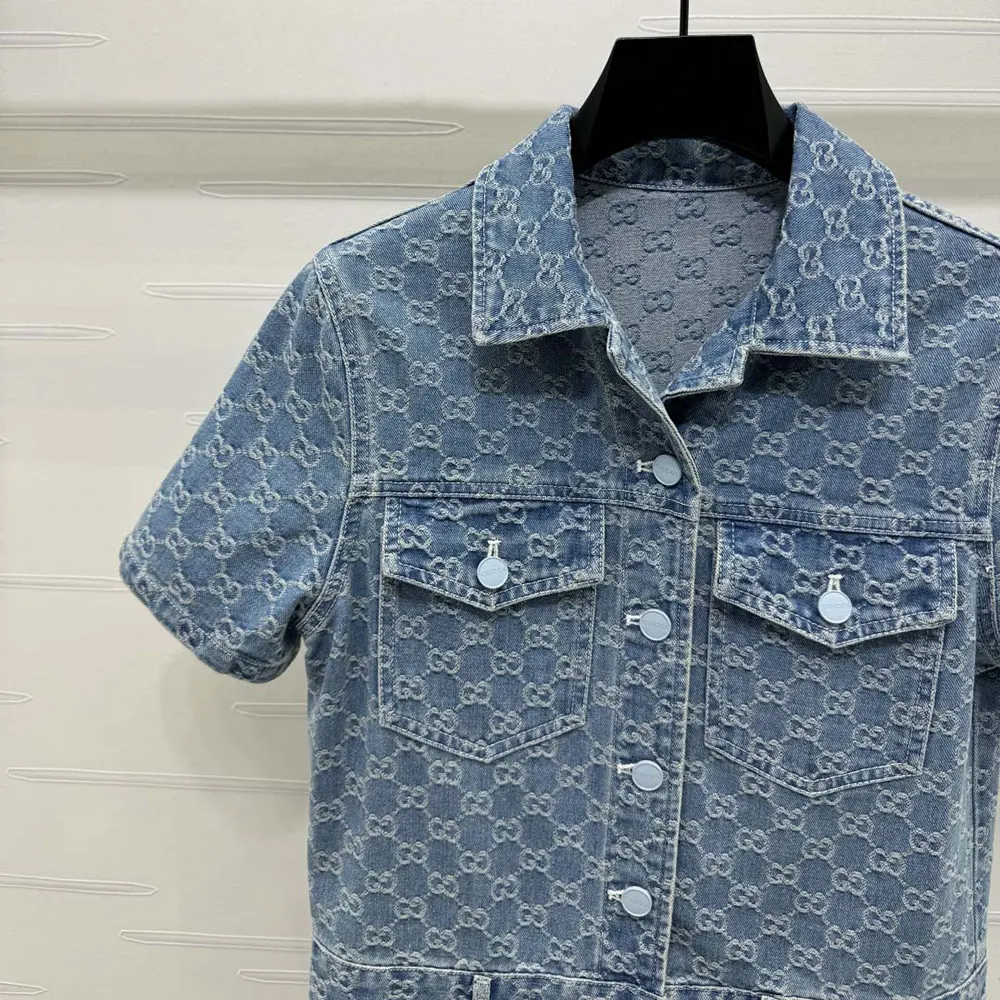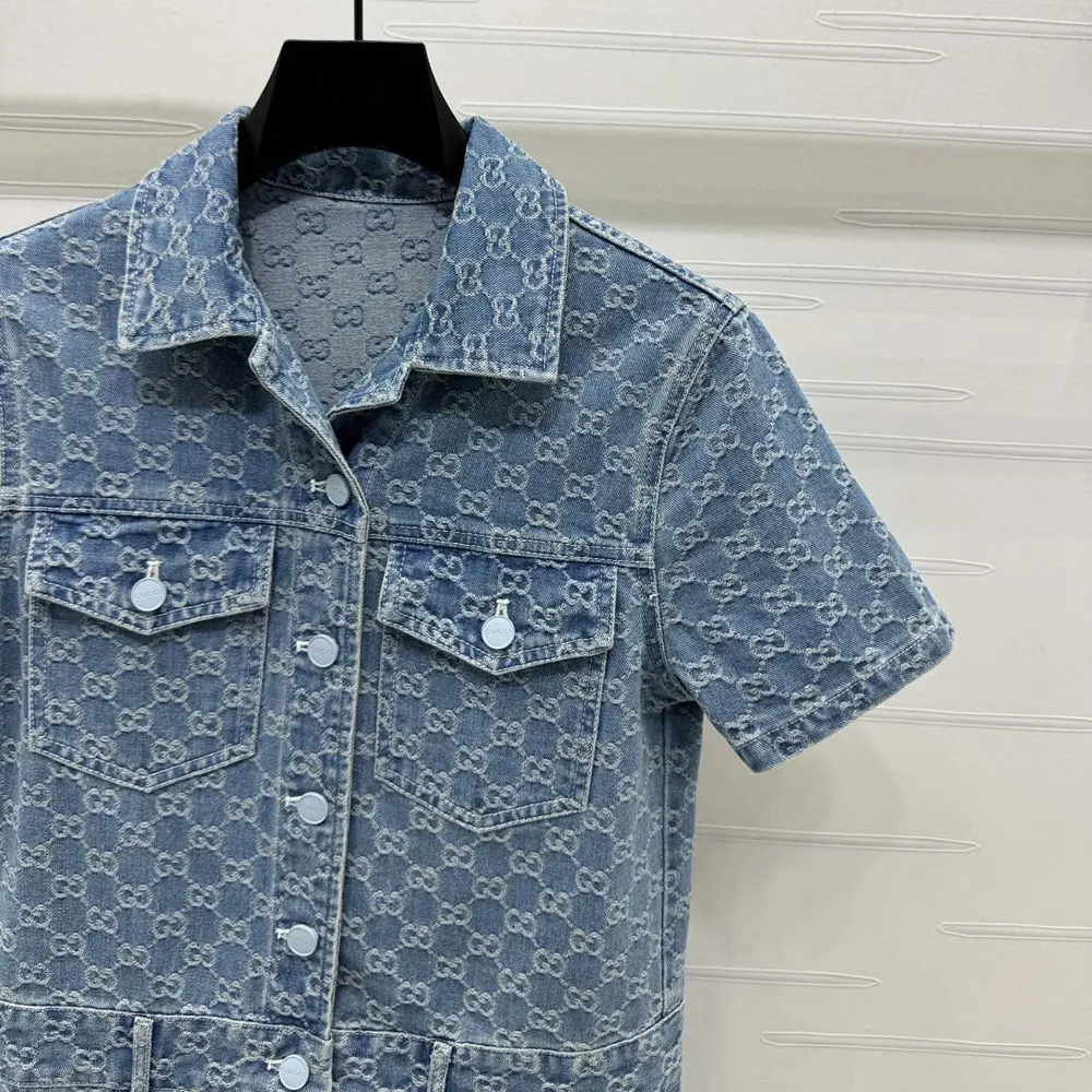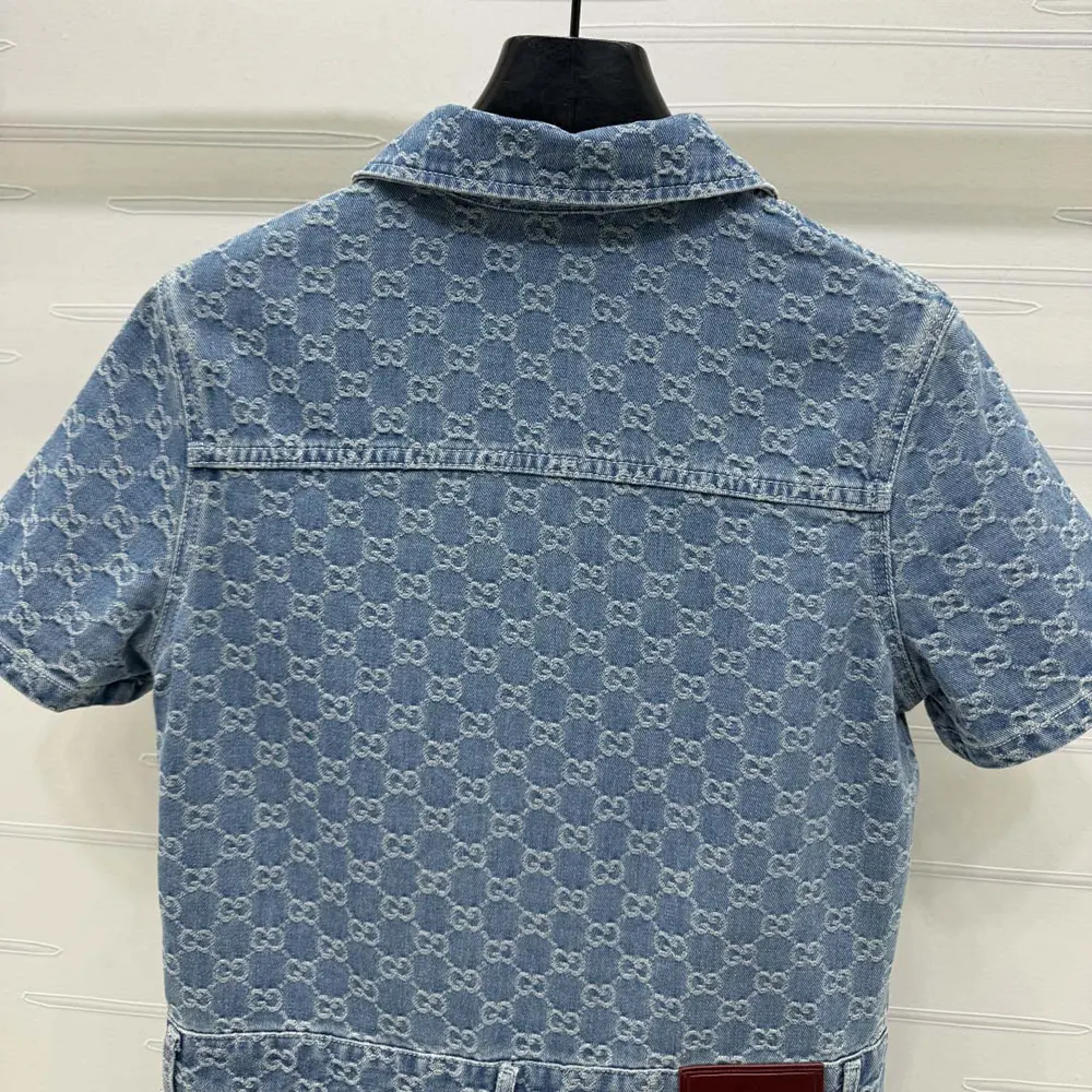 - The GG denim jacquard returns atop a contemporary jumpsuit silhouette, complete with tonal enamel Gucci buttons.
