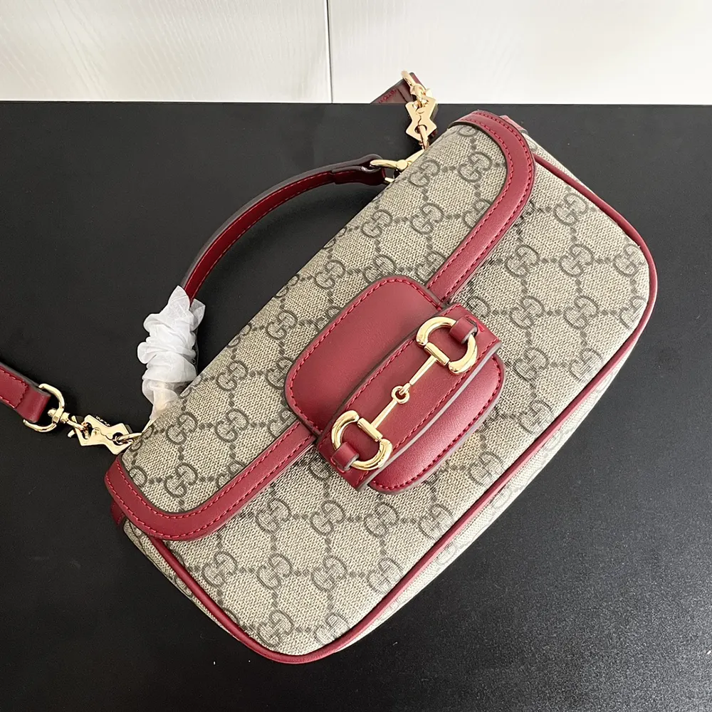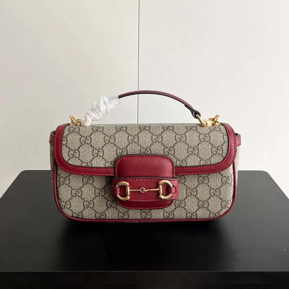 - This beige and dark brown Gucci Horsebit 1955 mini bag comes with refined leather trim in the Rosso Ancora red.