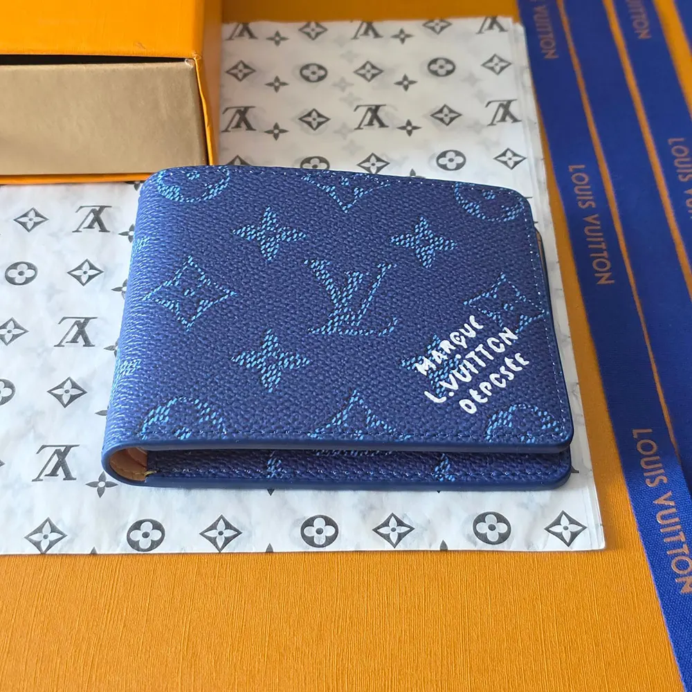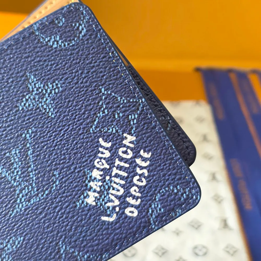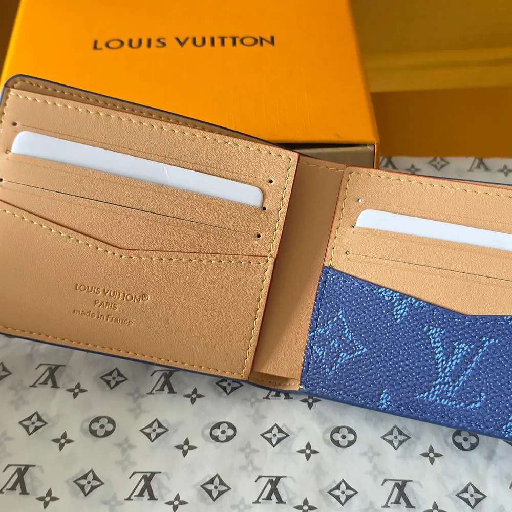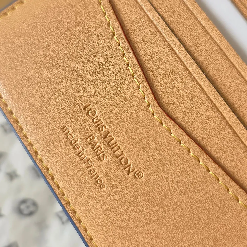 - The Slender Wallet is made from bold-colored Monogram Heritage coated canvas with the “Marque L.Vuitton Déposée” signature printed on the front.