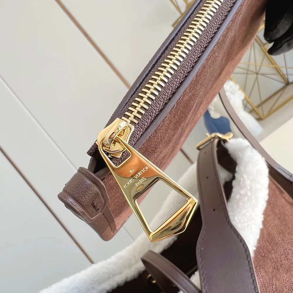 Louis Vuitton LV Women CarryAll PM Suede Calfskin Leather and Shearling-Chocolate