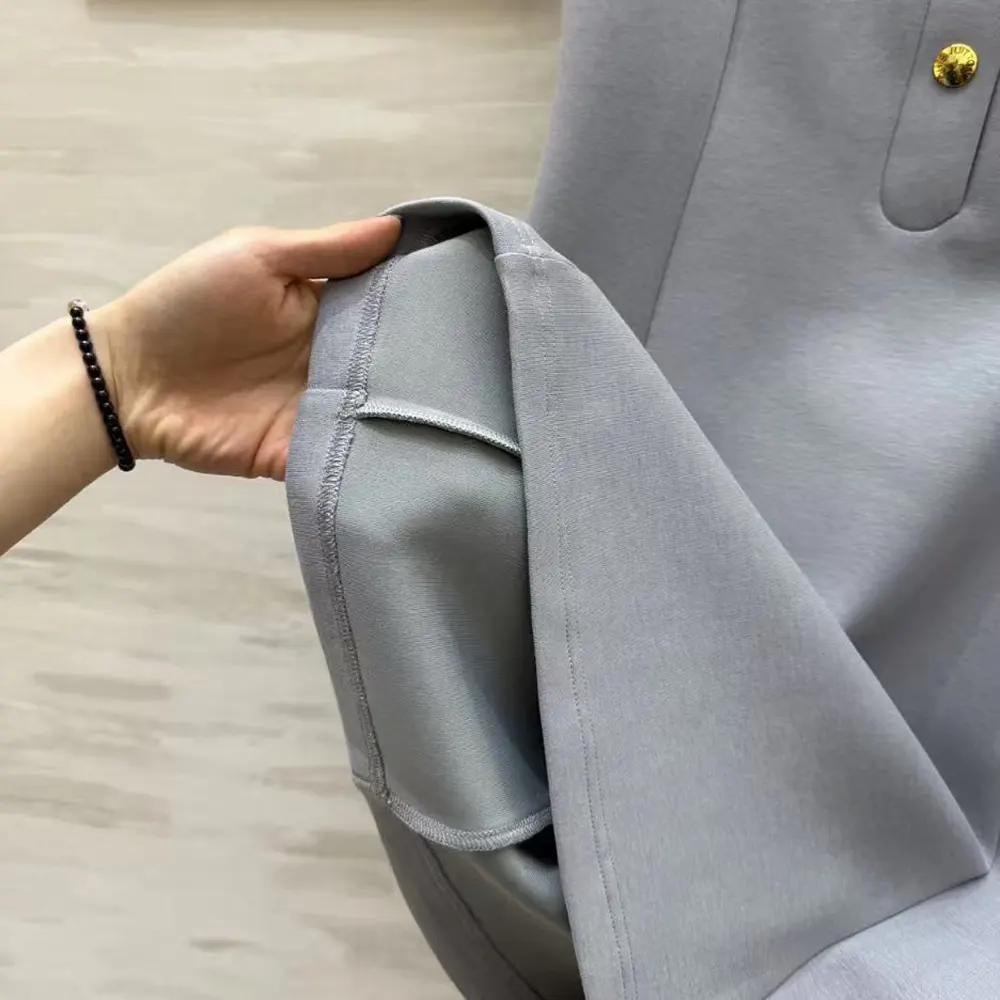 - The chic standing collar and cap sleeves are color-blocked for a playful contrast.