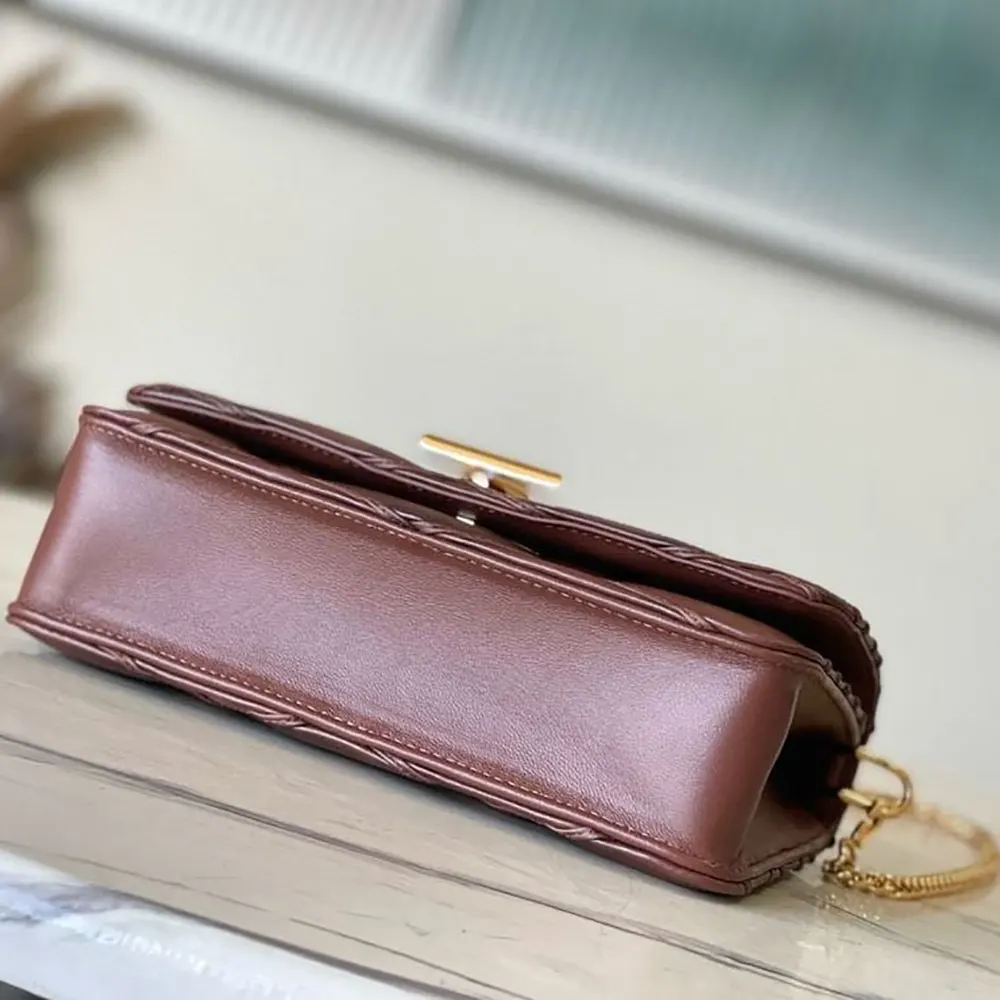 • It is crafted from precious quilted lambskin leather and is elevated with signature details including an LV lock and an interlaced round sliding chain that offers multiple styling options.