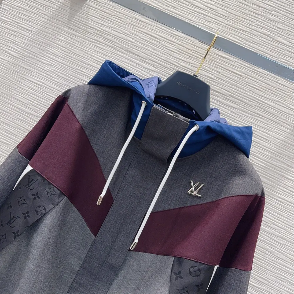 - This windbreaker twists sporty and sophisticated codes in elegant tailoring wool detailed with graphic color-blocked inserts across the body, as well as a contrasting hood.