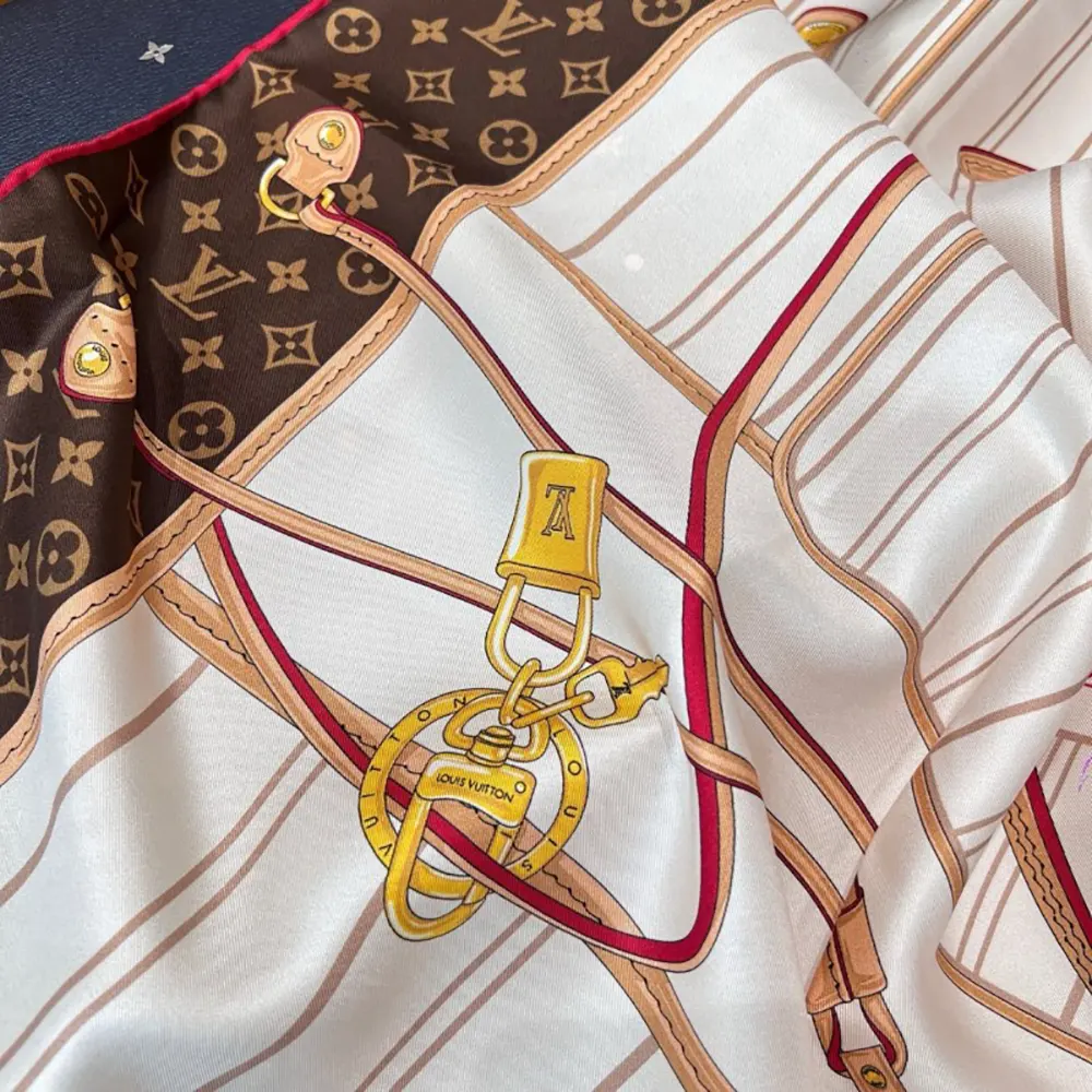- Printed on pure silk, its eye-catching design depicts the straps of the Neverfull bag, accented by timeless icons like an LV Circle and a padlock.