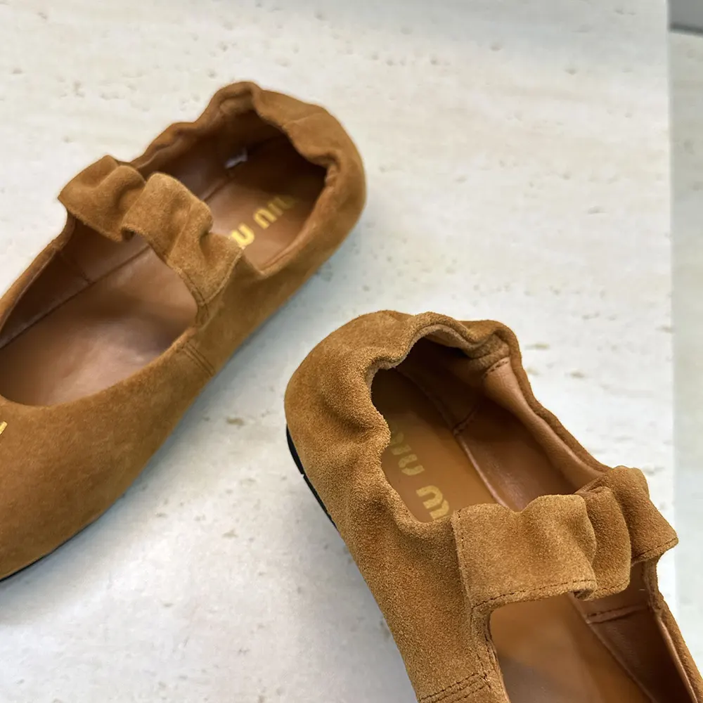 • The light, elegant line of these Ruches ballerina flats is enriched with gathered details and soft suede, interpreted with the versatility of Miu Miu codes. l