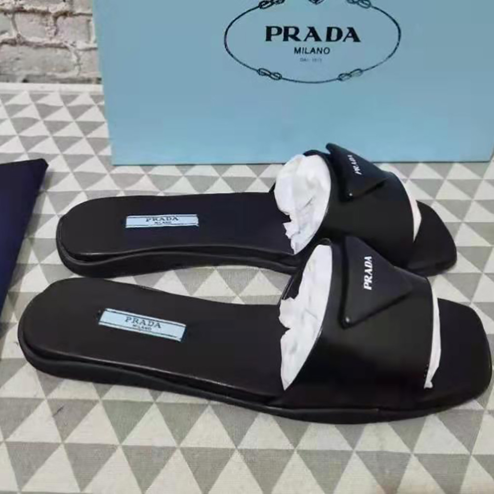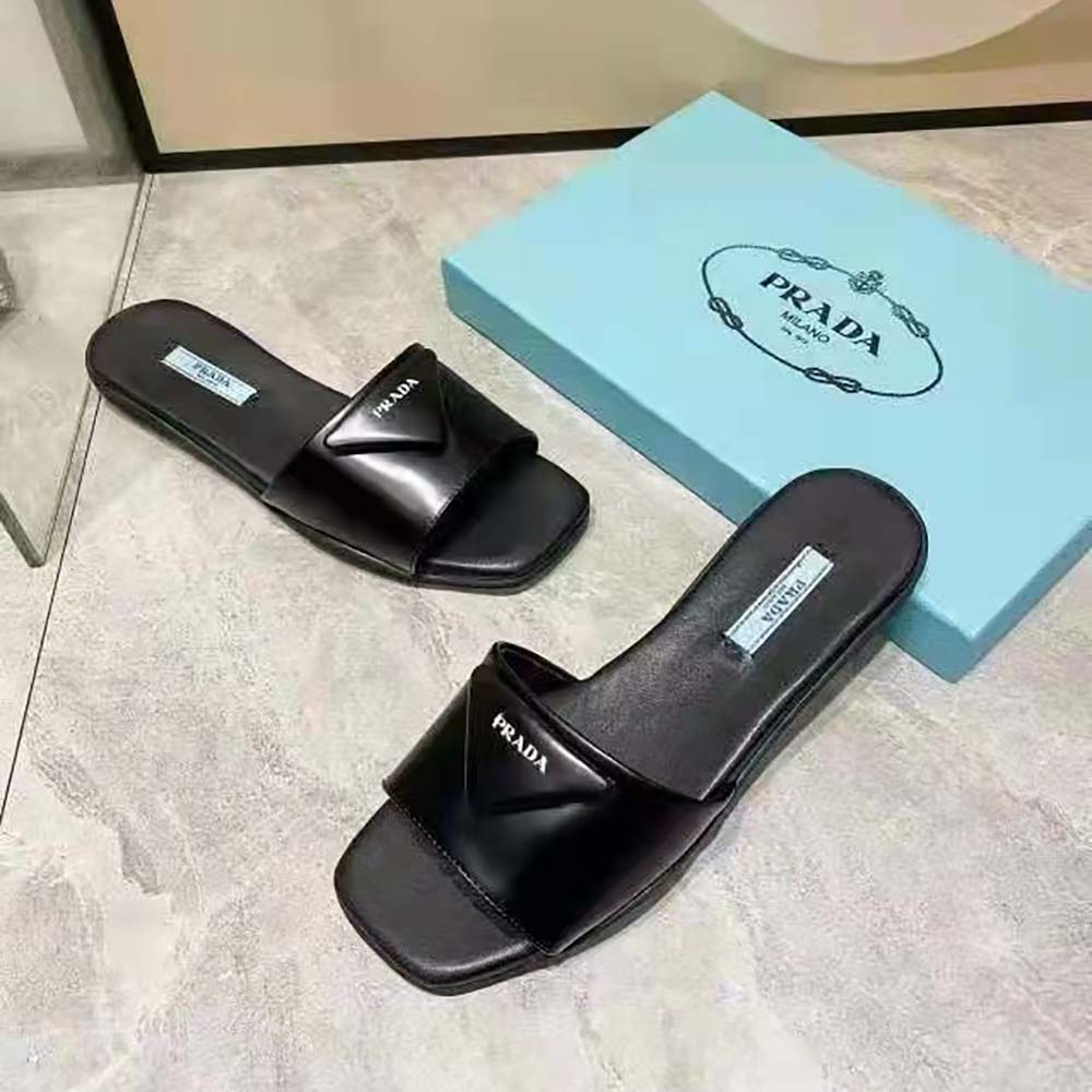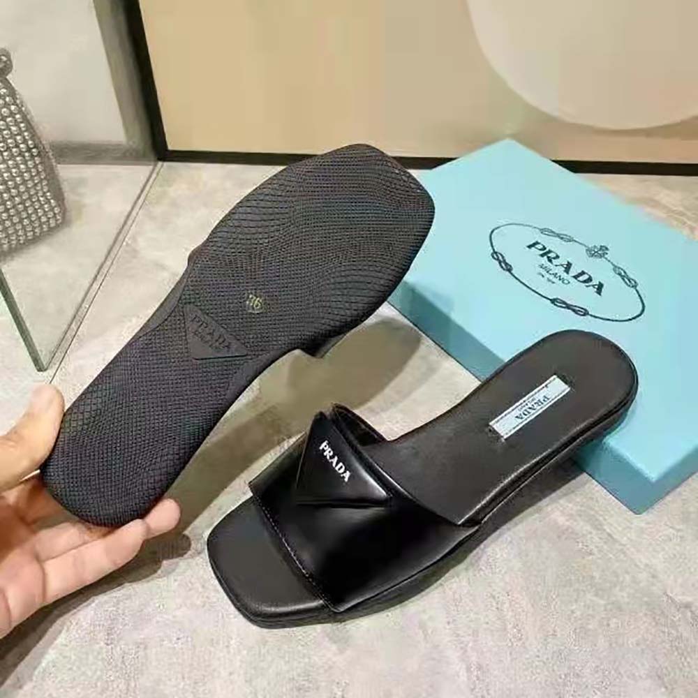 Specification: Prada Women Brushed Leather Slides Triangle Logo-Black