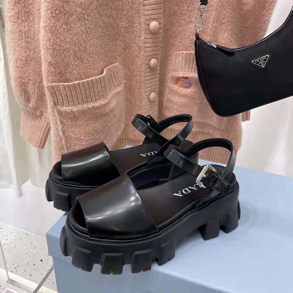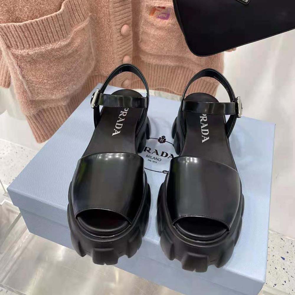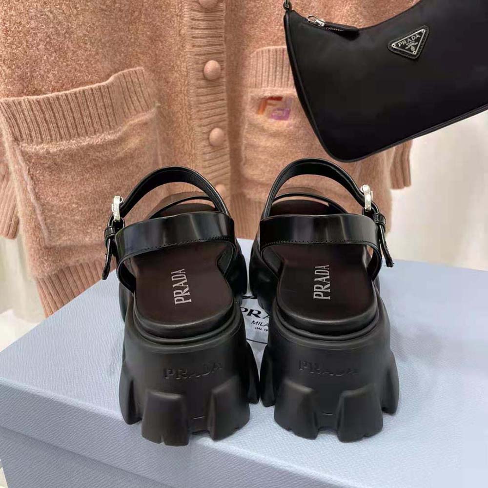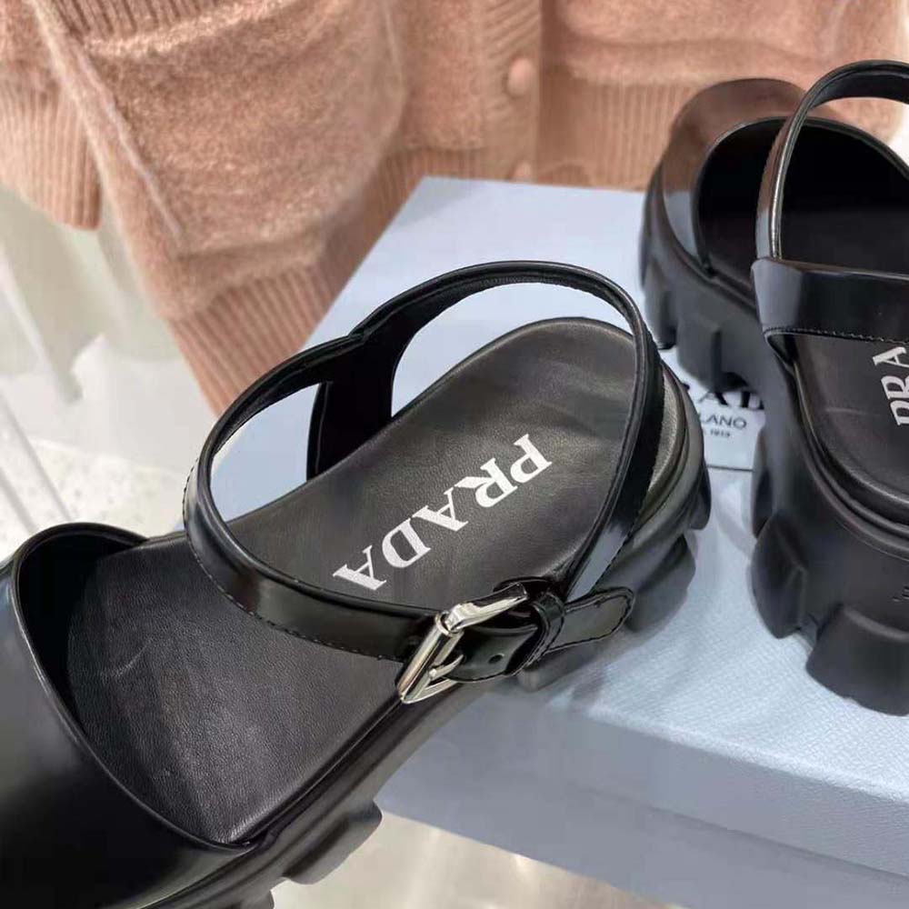 Specification: Prada Women Monolith Brushed Leather Sandals in 55mm Heel-Black