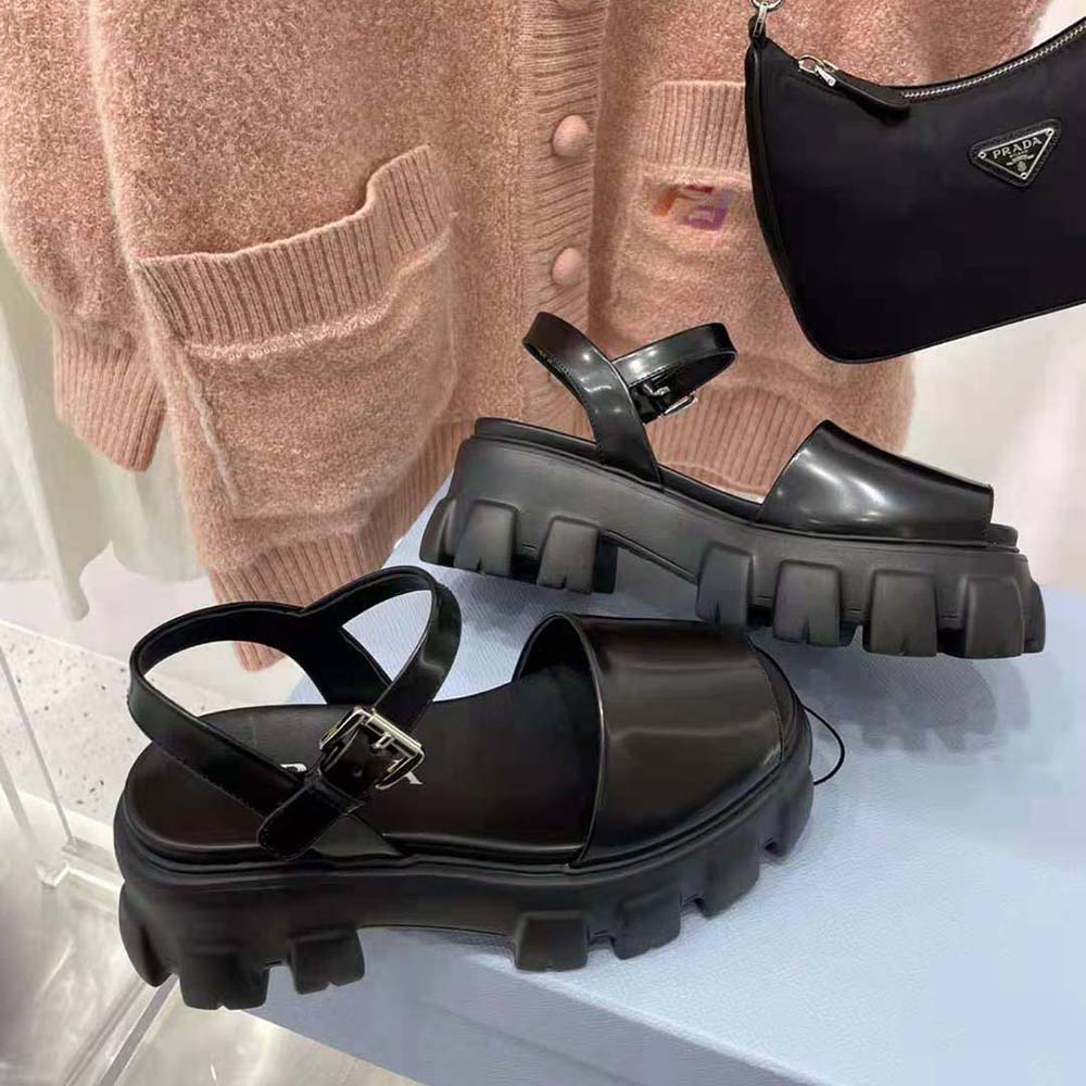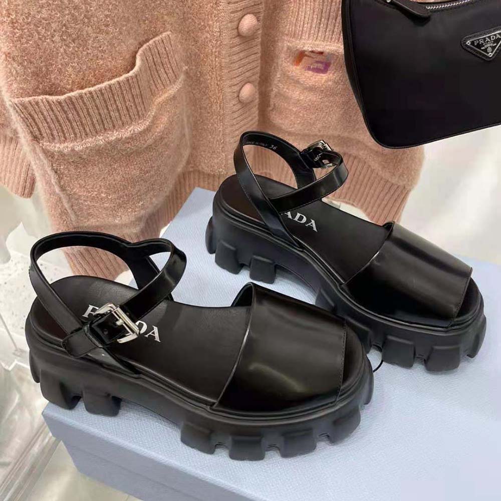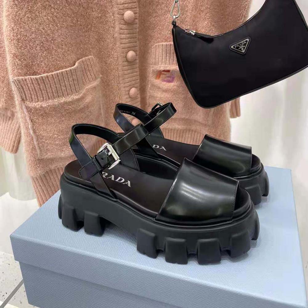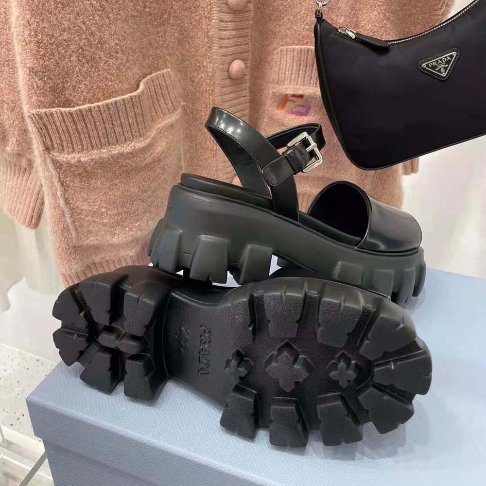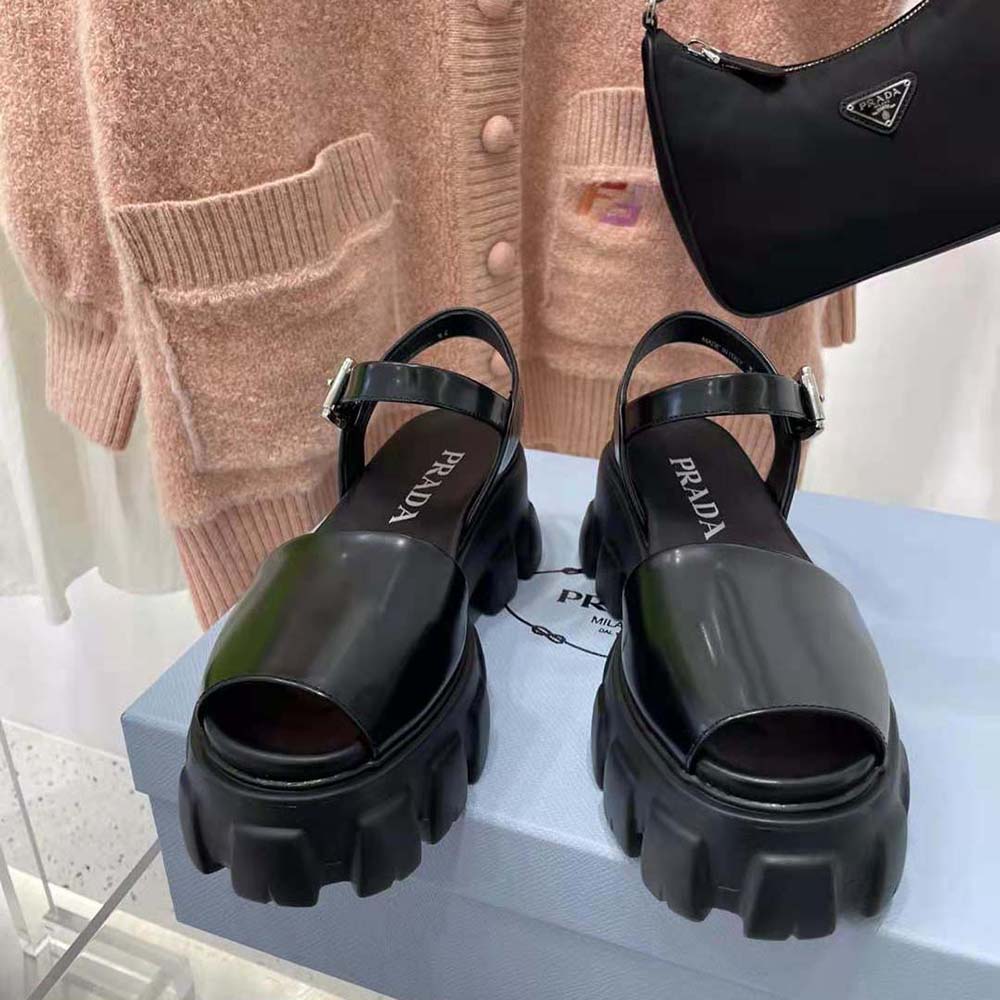 Specification: Prada Women Monolith Brushed Leather Sandals in 55mm Heel-Black
