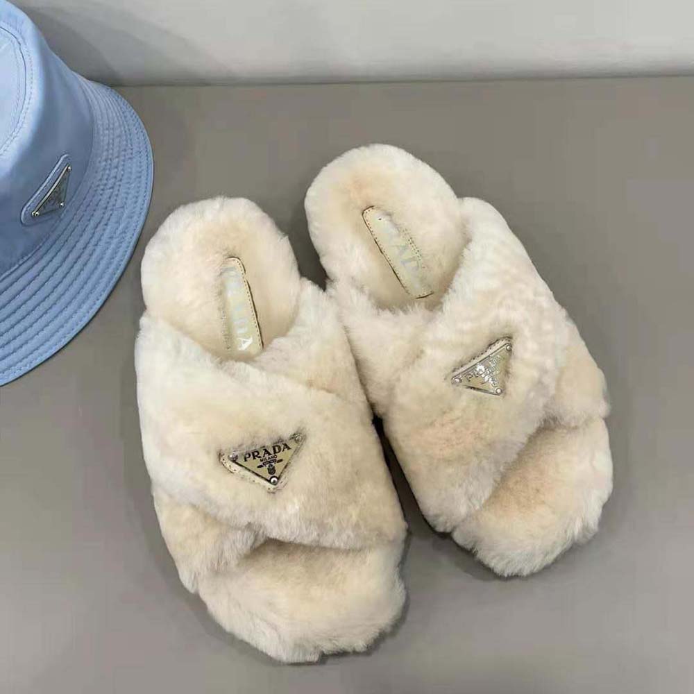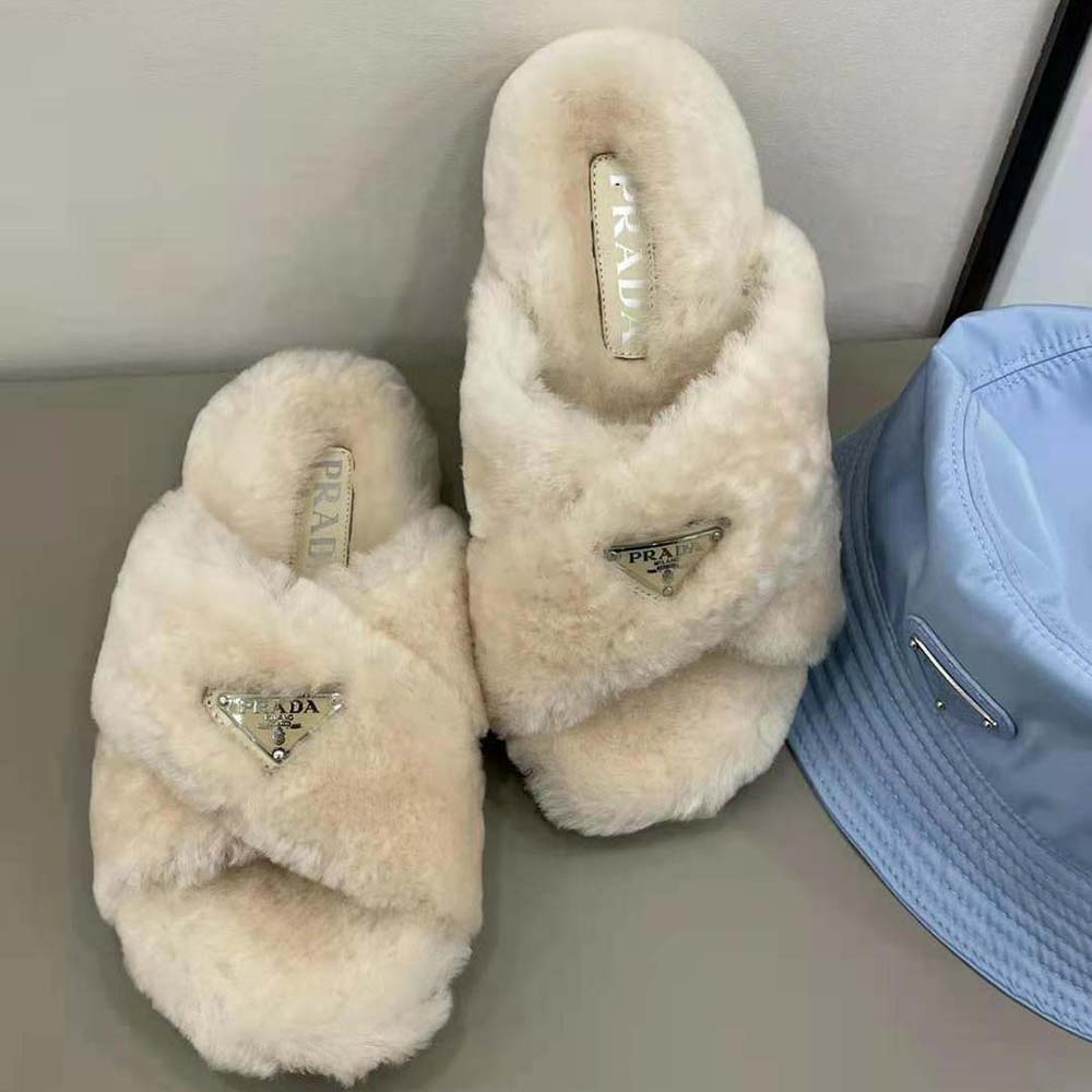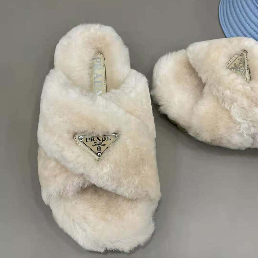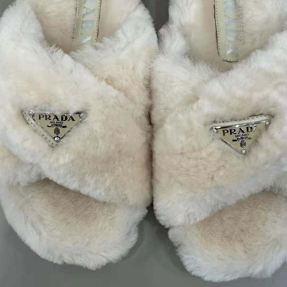 Specification: Prada Women Shearling Sandals in 20mm Heel-Sandy