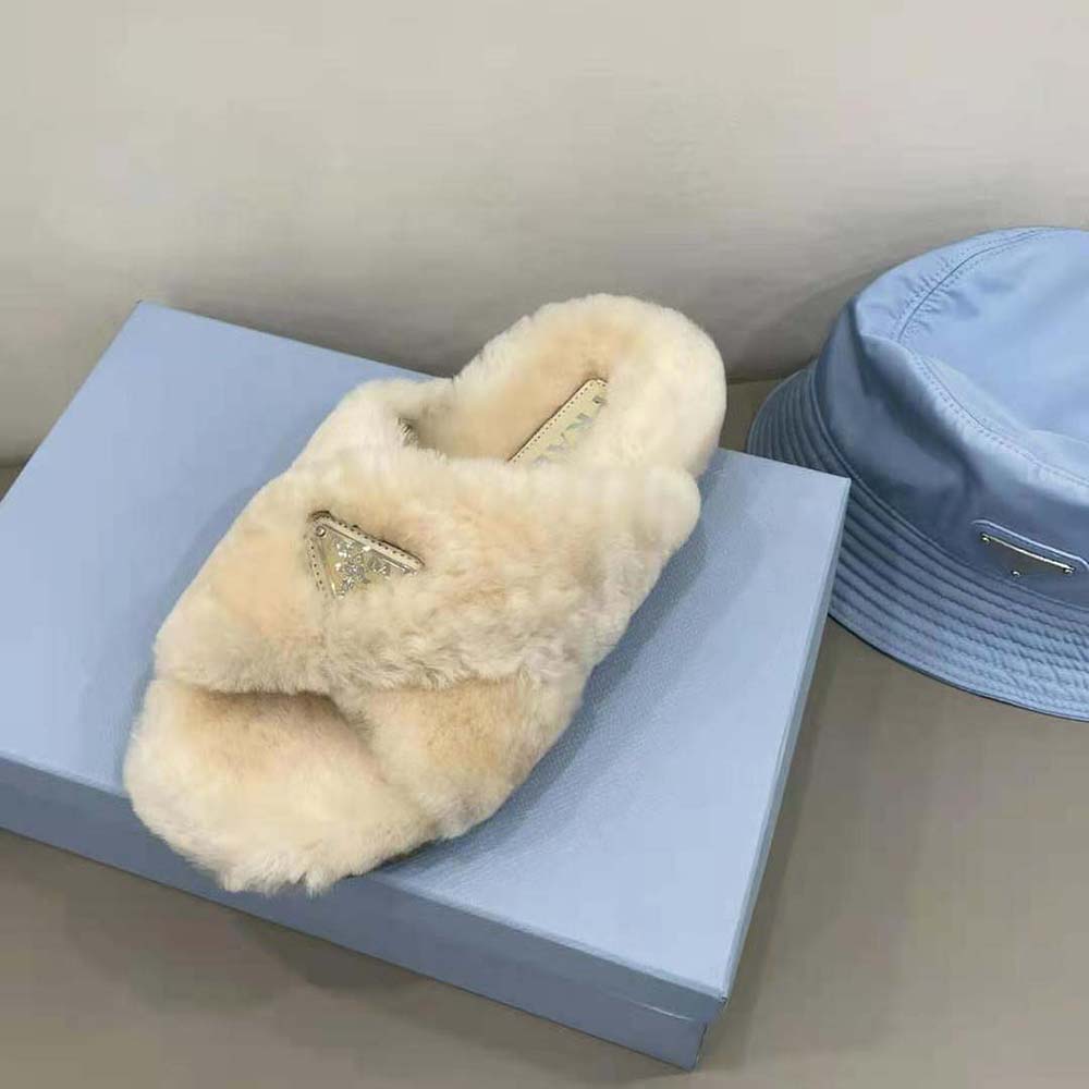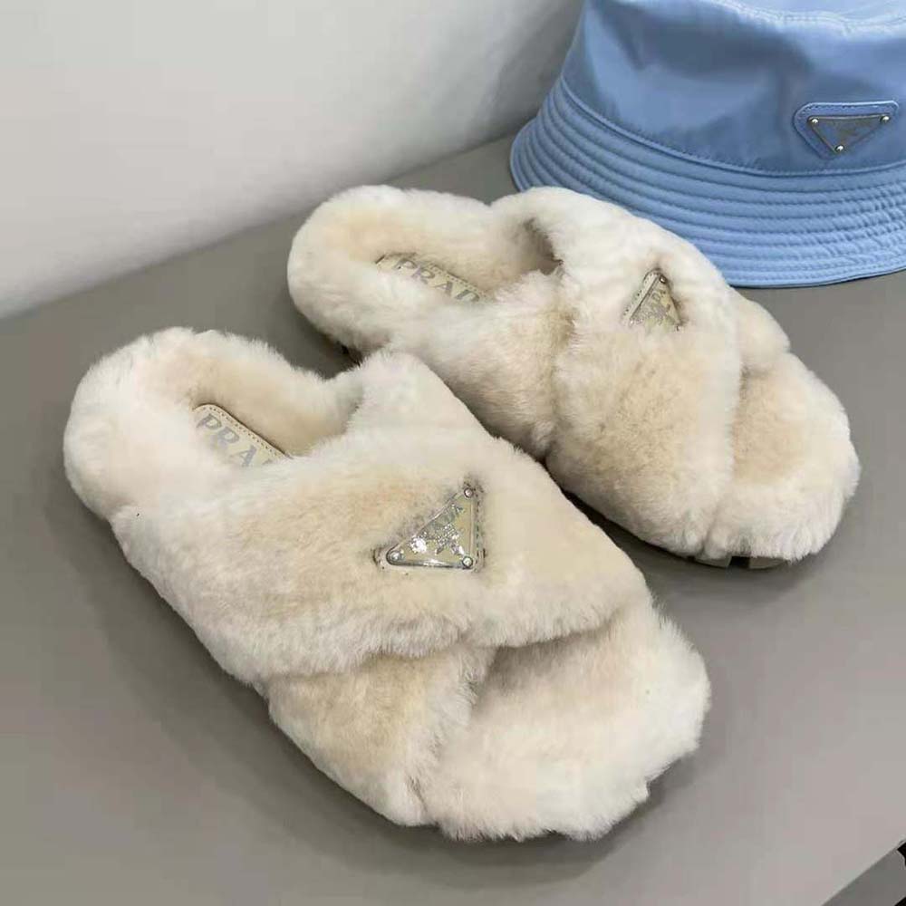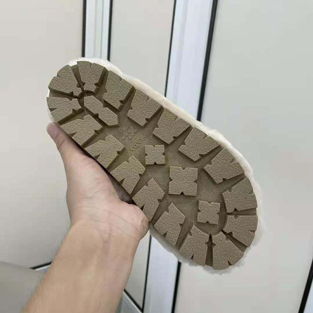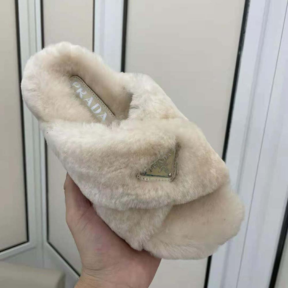 Specification: Prada Women Shearling Sandals in 20mm Heel-Sandy