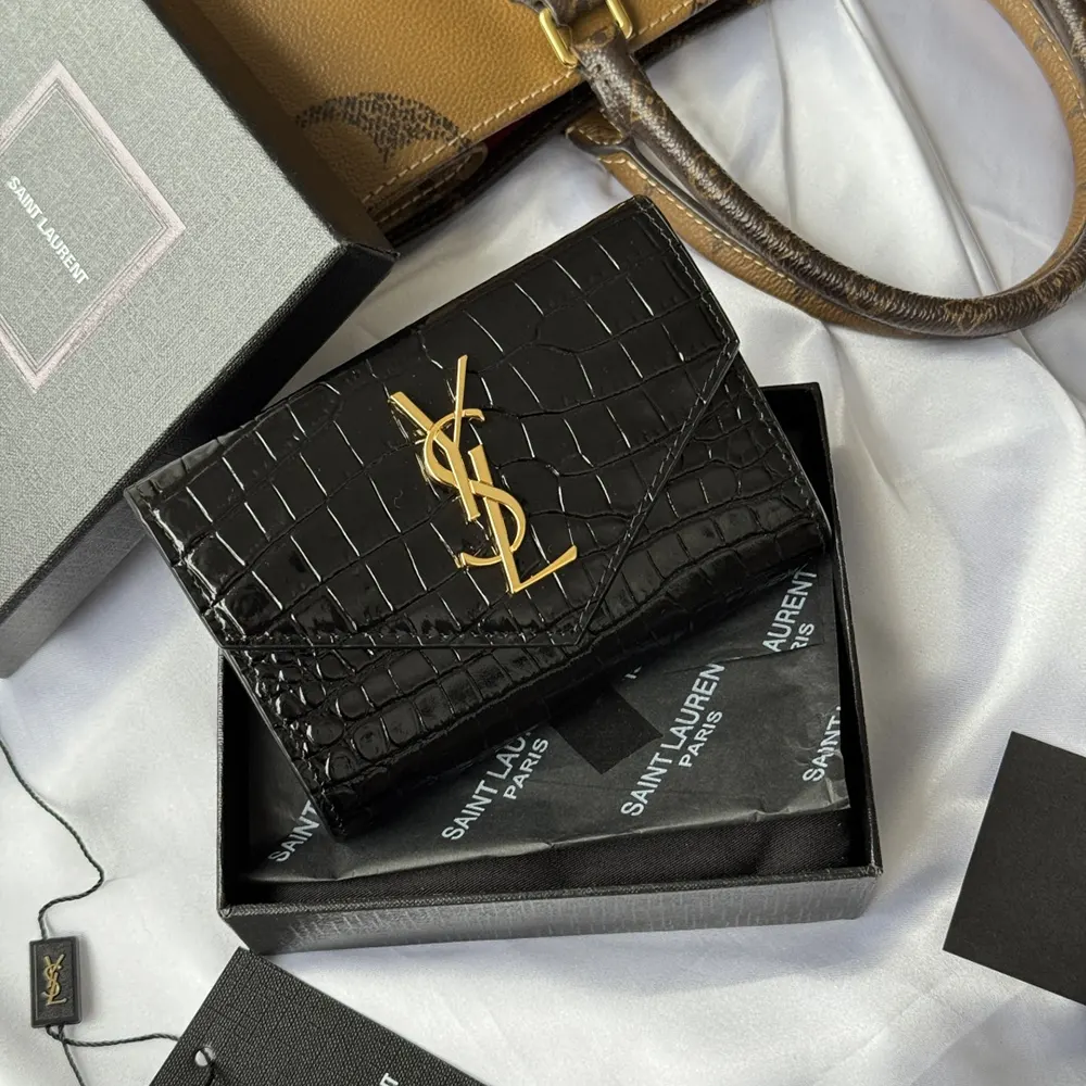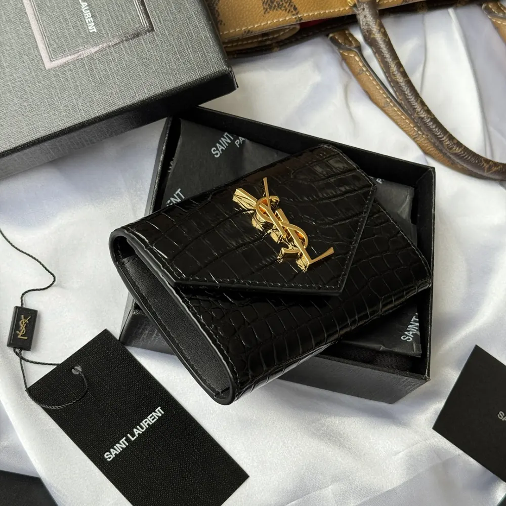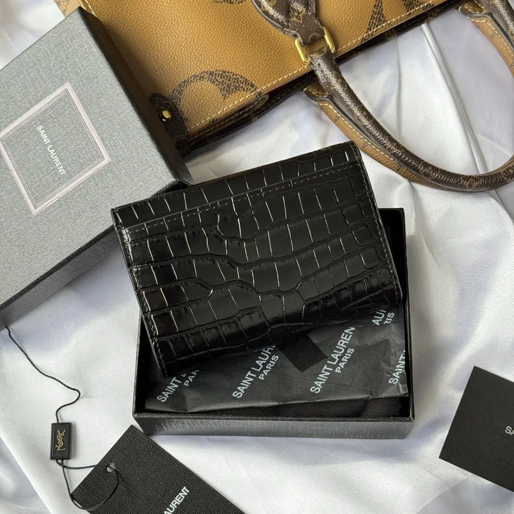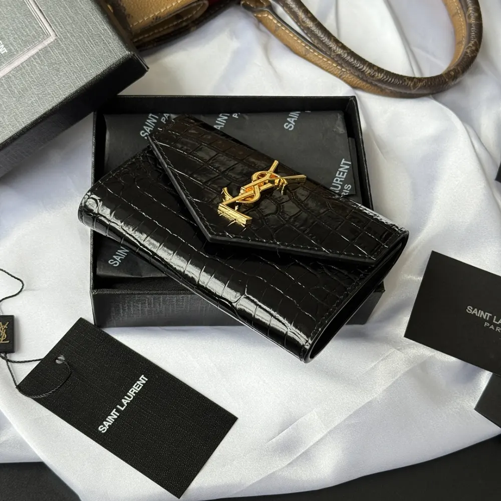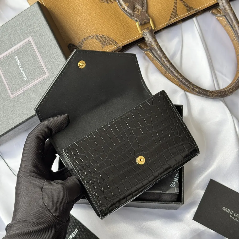 Saint Laurent YSL Women Uptown Flap Card Case in Crocodile-Embossed Shiny Leather