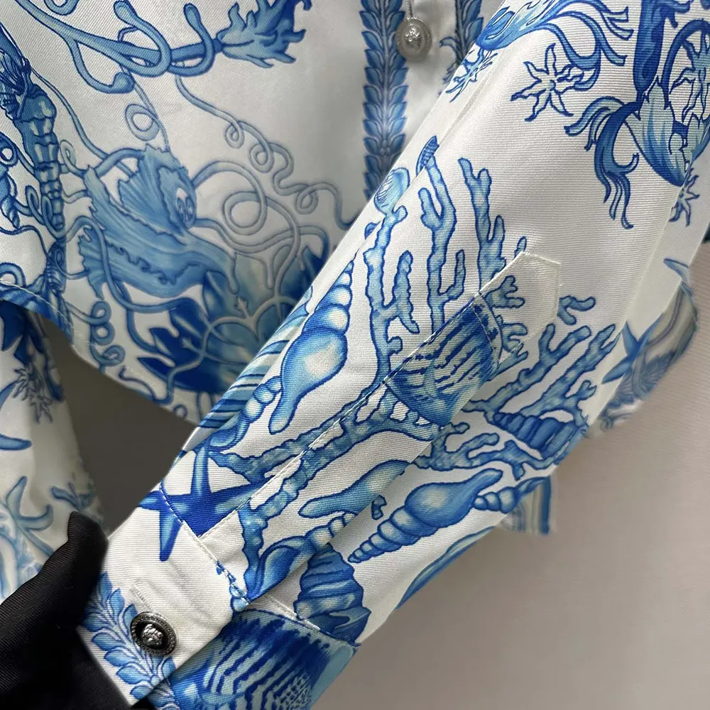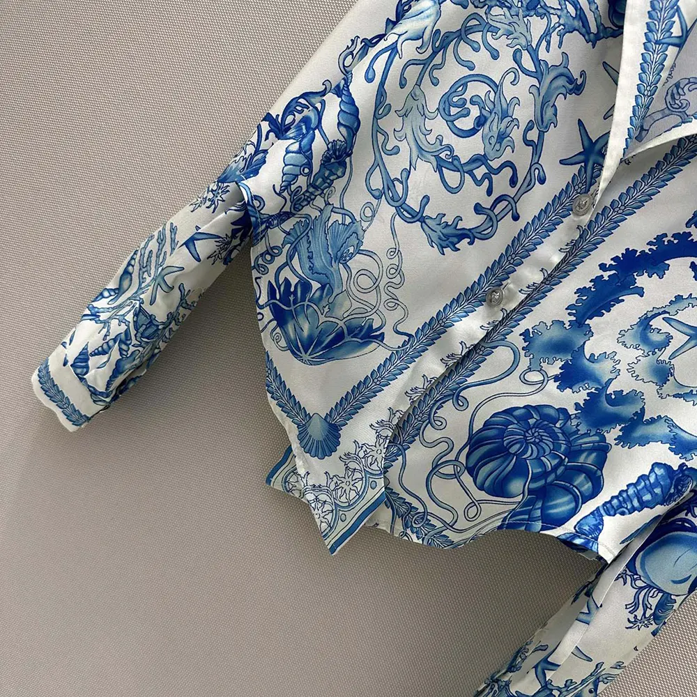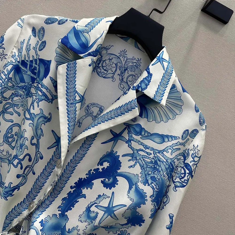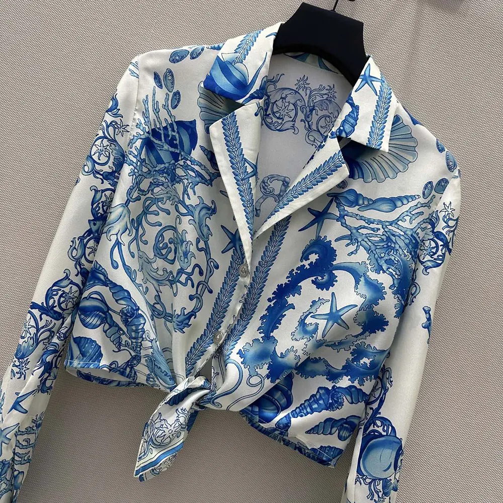 - A long-sleeved cropped shirt in cotton poplin featuring an Underwater Barocco print with seashell,